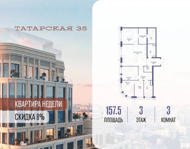 Продается просторная квартира площадью 158.00 м2 в жилом комплексе ТАТАРСКАЯ, 35. Квартира находится в 2 секции корпуса 3. Этаж 16-й из 23. Квартира без чистовой отделки, с просторной кухней 58.00 м2. Жилая площадь 61.70 м2. Высота потолка от 3.50. ТАТАРСКАЯ, 35 - новая архитектурная доминанта Замоскворечья, достопримечательность на фотопанорамах исторического центра Москвы. Элитный дом, созданный для тех, кто умеет смотреть далеко вперед, мыслить масштабно и воплощать собственный сценарий жизни. Вдохновляющие прогулки по променаду набережной, в уютных переулках, в парке "Зарядье", в Михайловском саду и Репинском сквере. Наслаждение высоким искусством в Третьяковской галерее, Доме Музыки, театральном музее им. А.А. Бахрушина, театре на Малой Ордынке. За окнами - Кремль, высотка на Котельнической, панорамы Замоскворечья и острова Балчуг, огни Садового кольца. Собственные спорт-румы, детская, репетиторская, бьюти-пространства, деловое пространство с коворкингом, переговорной и сигарной. Собственный трехуровневый фитнесс-центр с бассейном, тренажерным залом, сауной, хаммамом, массажным кабинетом. Площадь двора - 1,8 га, половина территории покрыта деревьями, кустарниками и лужайками. Дом расположен внутри Садового кольца - отсюда в считанные минуты можно добраться до важнейших мест столицы: достопримечательностей и парков, театров и ресторанов, деловых и административных центров. 7 минут до Кремля на автомобиле, 15 минут до Третьяковской галереи и 8 минут до Садового кольца пешком. Планировочные решения и визуализации предварительны, возможны изменения.