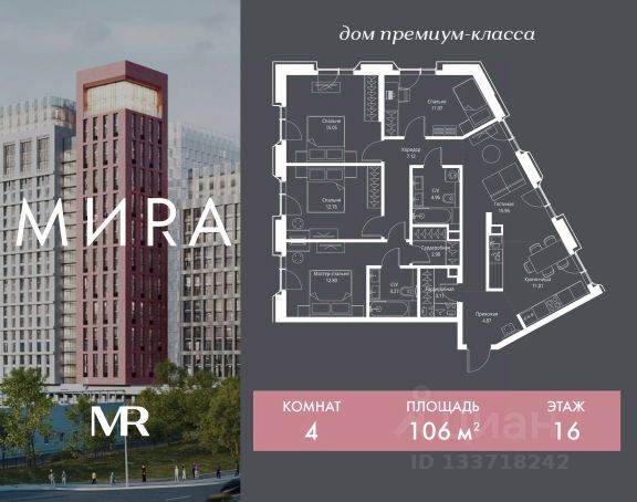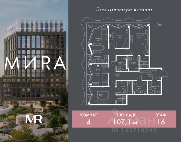 Прямая продажа от застройщика. Продаётся 4-комнатная квартира общей площадью 107.14 м² без отделки в доме премиум-класса МИRА на 16-м этаже 17 этажного дома. Квартира расположена в корпусе 1. Дом премиум-класса МИRA это: • Спокойный район с богатой историей и сложившейся инфраструктурой • Авторская архитектура на стыке классики и современности • Вход в парк прямо из жилого комплекса • Панорамные виды на Яузу, парки, ВДНХ и скульптуру "Рабочий и колхозница" • Удобные сервисы и безопасность для каждого резидента Расположение: Жилой квартал расположен в Алексеевском районе на северо-востоке Москвы, на второй линии домов, таким образом вы сможете дистанцироваться от шума и суеты проспекта Мира, но при этом будете жить недалеко от этой важной городской магистрали. Прямо у дома: • Парк Акведук • Река Яуза • Памятник "Рабочий и колхозница" Пешком: • 16 мин м. ВДНХ На автомобиле: • 12 мин ТТК • 15 мин Садовое кольцо • 12 мин Национальный парк "Лосиный остров" Благоустройство: Концепция благоустройства от бюро "ДРУЖБА" разработана в стиле "Лесная тропа". В уютном дворе расположились словно затерянные в лесу, площадки для отдыха. Они разделяются островками с травами, кустарниками, крупными камнями и деревьями, между которыми проходят узкие песчаные тропинки с деликатной подсветкой по вечерам. Центральной точкой притяжения для жителей станет главная площадь с фонтаном, которая открывается сразу из двух входных групп. Внутренний двор МИRA: • Детская площадка с зонами для игр малышей до трех лет и детей более старшего возраста • Спортивная площадка с профессиональным оборудованием для тренировок • Декоративные перголы • Воздушный арт-объект с подсветкой, похожий на облако • Чайный домик, где в отдельном отапливаемом павильоне можно в любое время года попить кофе с соседями или устроить камерное семейное чаепитие • Зоны для работы и отдыха с гамаком под навесом, скамейками и креслами Инфраструктура и окружение: В Алексеевском районе есть огромные благоустроенные парки, магазины, гимназии с высоким рейтингом и филиалы ВУЗов, частные и государственные детские сады, модные кофейни и фитнес-центры. В квартале МИRА предусмотрены: • 2 ресторана с видом на парк Акведук • 3 кафе • фитнес-студия • подземный паркинг на 330 машино-мест Компания MR предлагает своим клиентам специальные условия приобретения квартир в рамках программ ипотечного кредитования от банков-партнеров.