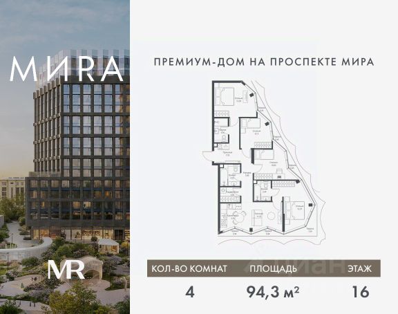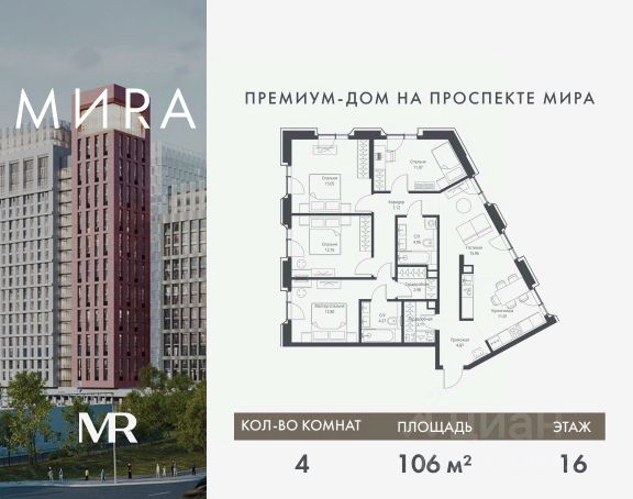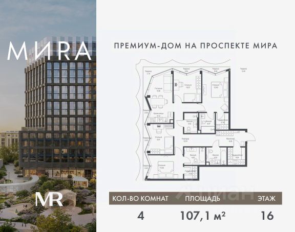 Прямая продажа от застройщика. Продаётся 4-комнатная квартира общей площадью 107.14 м² без отделки в доме премиум-класса МИRА на 16-м этаже 17 этажного дома. Квартира расположена в корпусе 1. Дом премиум-класса МИRA это: • Спокойный район с богатой историей и сложившейся инфраструктурой • Авторская архитектура на стыке классики и современности • Вход в парк прямо из жилого комплекса • Панорамные виды на Яузу, парки, ВДНХ и скульптуру "Рабочий и колхозница" • Удобные сервисы и безопасность для каждого резидента Расположение: Жилой квартал расположен в Алексеевском районе на северо-востоке Москвы, на второй линии домов, таким образом вы сможете дистанцироваться от шума и суеты проспекта Мира, но при этом будете жить недалеко от этой важной городской магистрали. Прямо у дома: • Парк Акведук • Река Яуза • Памятник "Рабочий и колхозница" Пешком: • 16 мин м. ВДНХ На автомобиле: • 12 мин ТТК • 15 мин Садовое кольцо • 12 мин Национальный парк "Лосиный остров" Благоустройство: Концепция благоустройства от бюро "ДРУЖБА" разработана в стиле "Лесная тропа". В уютном дворе расположились словно затерянные в лесу, площадки для отдыха. Они разделяются островками с травами, кустарниками, крупными камнями и деревьями, между которыми проходят узкие песчаные тропинки с деликатной подсветкой по вечерам. Центральной точкой притяжения для жителей станет главная площадь с фонтаном, которая открывается сразу из двух входных групп. Внутренний двор МИRA: • Детская площадка с зонами для игр малышей до трех лет и детей более старшего возраста • Спортивная площадка с профессиональным оборудованием для тренировок • Декоративные перголы • Воздушный арт-объект с подсветкой, похожий на облако • Чайный домик, где в отдельном отапливаемом павильоне можно в любое время года попить кофе с соседями или устроить камерное семейное чаепитие • Зоны для работы и отдыха с гамаком под навесом, скамейками и креслами Инфраструктура и окружение: В Алексеевском районе есть огромные благоустроенные парки, магазины, гимназии с высоким рейтингом и филиалы ВУЗов, частные и государственные детские сады, модные кофейни и фитнес-центры. В квартале МИRА предусмотрены: • 2 ресторана с видом на парк Акведук • 3 кафе • фитнес-студия • подземный паркинг на 330 машино-мест Компания MR предлагает своим клиентам специальные условия приобретения квартир в рамках программ ипотечного кредитования от банков-партнеров.