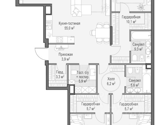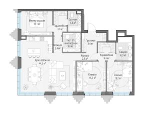 Просторная квартира площадью 152,4 кв. м. Из кухни-гостиной (41,2 кв. м) открывается панорамный вид на красивый двор-парк с ландшафтным дизайном и вечерней подсветкой. Продуманная планировка позволяет разместить три приватные спальни, в одной из которых, примыкающей к мастер-спальне, предусмотрен санузел с окном, что делает ваше личное пространство по-настоящему комфортным. Окна выходят на три стороны. Life Time - роскошный современный квартал на Пресне, в наиболее быстро растущем премиальном районе ЦАО. Его насыщенная инфраструктура и выгодное расположение дарят время для жизни. Вы больше не тратите его на дорогу или ожидание, при этом ни в чём себе не отказывая. На территории предусмотрено всё для комфортной жизни: • двор-парк площадью 1,8 гектара с прудом и фонтанами; • Clubhouse - инфраструктурный центр в отдельном здании с исчерпывающими возможностями для спорта, отдыха и досуга только для жителей; • спортивная инфраструктура на улице и в помещении, в том числе бассейн длиной 25 метров, хот-таб, хаммам, сауна, бьюти-зона; • клубная гостиная с террасой; • всё для развития и досуга детей любого возраста, в том числе детский сад и школа. Life Time находится в центре сложившегося премиального района, в окружении многочисленных парков. Удобная транспортная доступность и прямой выезд на Звенигородское шоссе позволяют без проблем добраться до Садового кольца и Москва-Сити. Архитектурный стиль квартала - роскошный минимализм. Дома десятилетиями будут выглядеть современно.
