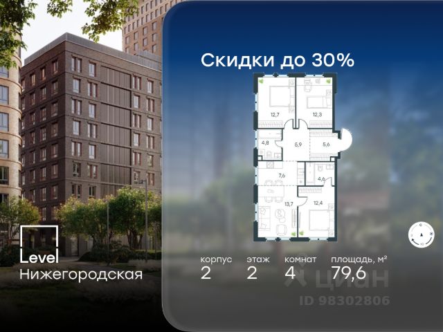 Продажа 4-комнатных квартир на 2 этаже рядом с метро Нижегородская (Большая кольцевая линия)