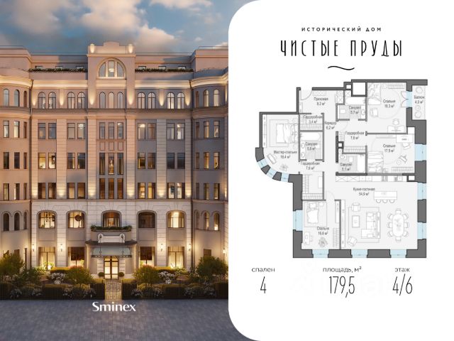 Роскошная квартира площадью 179,5 кв. м. с высотой потолка 3,9 метра. Гостиная с видом на три стороны света и большими окнами дарит пространству много света и воздуха. Из окон открываются виды на итальянский приватный сад и исторические павильоны 19 века. Элегантный сферический эркер добавит кабинету или спальне уюта и изысканности. Спальни размещены на одной стороне квартиры, кабинет и кухня-гостиная - на противоположной, что гарантирует комфорт всем членам семьи, разделив зоны на приватные и общественные. "Чистые Пруды" - исторический дом на 34 квартиры в уникальном атмосферном районе Москвы, в 50 метрах от Чистых прудов. Это одно из самых романтичных и престижных мест столицы. Дом расположен в глубине квартала, в окружении тихих переулков - в полной тишине и приватности старого московского двора. "Чистые Пруды" - деликатно реконструированный исторический дом с изысканной архитектурой начала прошлого века авторства барона Отто фон Дессина. У дома максимально сохранены архитектурные формы 1915 года и подлинные кирпичные стены. В "Чистых Прудах" создана небывалая для таких домов инфраструктура. Только для жителей на месте каретного двора XIX века расположен Clubhouse с пространствами для общения соседей, здорового образа жизни и развития детей. В Lounge выделены каминная, патио, зона для проведения мастер-классов и настольных игр. Работает бесплатный фитнес по стандарту Fit Lab с зонами кардио, силовых тренажёров, свободных весов и функционального тренинга. Для детей в Clubhouse создана игровая комната по стандарту Kid`s Lab. Есть свой всесезонный двор-сад. В доме представлены роскошные квартиры с дровяными каминами и высокими потолками от 3,9 до 5,4 м. О жителях и доме заботится Служба комфорта Smineх, которая предлагает сервис уровня 5-звёздочных отелей и сохраняет изначальный облик и концепцию дома. Девелопер проекта - Sminex. Компания обладает 23-летним опытом строительства жилой и коммерческой недвижимости. В 2022 году Sminex приобрёл девелопера "Интеко", в 2024 году - "Инград". Сегодня Sminex - девелопер N1 элитной и премиальной недвижимости, который создаёт комфортную и престижную среду.