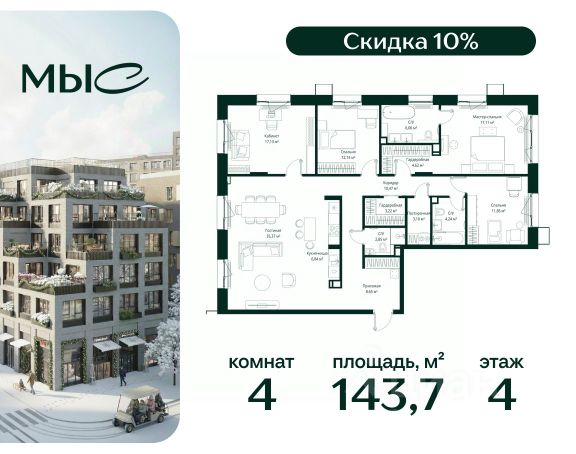 Прямая продажа от застройщика. Продаётся 4-комнатная квартира общей площадью 143.66 м² без отделки в премиальном жилом комплексе "МЫС" на 4-м этаже 12 этажного дома. Квартира расположена в корпусе "Сибирь". Проект МЫС — это, прежде всего, идеальное место для семей. В рамках проекта построят государственную школу, два детских сада и дворец спорта площадью 20 000 м2 с термальным комплексом, выплывным бассейном, фитнес-залом, теннисными, сквош и падел кортами и секциями для детей. На территории площадью, сравнимой с тремя парками Зарядье, появятся кафе и рестораны, пруд с набережной, спортивные и детские площадки, скейт-парк, лыжные и веломаршруты. Расположение: - 2 минуты до скоростной трассы М1 и Минского шоссе; - 10 минут до МКАД; - 15 минут до МЦД Лесной Городок - 20 минут до делового центра "Москва-Сити"; - 28 минут до аэропорта "Внуково". Благоустройство: - велосипедные и лыжные маршруты; - собственная набережная и парк; - лаунж-зоны в окружении природы; - беседки у очага; - дворец спорта площадью 20 000 м²; - термальный комплекс с тремя бассейнами; - 4 теннисных и падел-корта; - 6 сквош-кортов; - многофункциональный спортзал; - скейт-парк; - просторная площадь для прогулок с фонтаном; - детский клуб с творческими секциями; - гастро-доминанта; - кафе у пруда, рестораны, ритейл. Окружение - соседство с лесным фондом; - школа на 1250 мест и 2 детских сада на 350 и 255 мест; - Дубковский и Подушкинский леса, парк "Рассказовка", Мещерский парк. Действуют специальные условия при 100% оплате, подробности уточняйте у менеджера в офисе продаж.