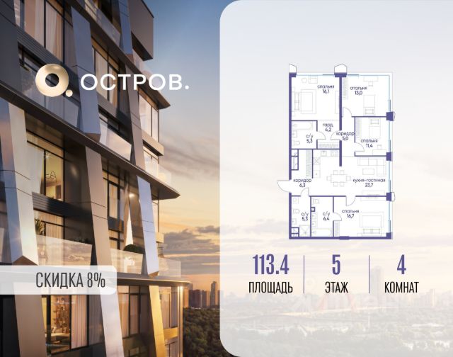 Цена указана с учётом скидки при 100%-й оплате, несубсидированной ипотеке, рассрочке (кроме программы "Рассрочка 0%"). В жилом квартале продаётся 4-комнатная квартира площадью 101.80 кв.м white box. Квартира расположена на 5 этаже 48 этажного корпуса 1 в жилом комплексе комфорт класса Левел Звенигородская (компания Level Group/Левел групп). Отличная транспортная доступность - 5 мин. пешком до метро "Звенигородская" (откроется к окончанию строительства); - 18 мин. пешком до станции МЦК "Хорошёво" и станции БКЛ "Народное ополчение"; - 4 мин. на авто до ТТК; - 8 мин. на авто до Садового кольца; - 15 мин. на авто до Кремля. Продуманный архитектурный проект - Концепция от студии Станислава Михаловского, в основу которой легло единение природы и города; - Двухкамерные стеклопакеты в окнах, алюминиевый и ПВХ профиль - в квартирах тепло зимой и прохладно летом; - С верхних этажей открываются панорамные виды на город, Москву-реку, "Москва-Сити" и Москворецкий парк; - Лобби со всеми удобствами: окна в пол, высокие потолки до 4,7 м, лаунж-зоны, колясочные, гостевые санузлы и мойки для лап животных; - Централизованные водонагреватели гарантируют круглогодичную подачу горячей воды в каждую квартиру. Благоустройство Концепция благоустройства разработана совместно с бюро UNK landscape. Высота башен приближается к 200 метрам - они словно касаются неба. Небесный простор проецируется на территорию двора с помощью подсветки, визуально увеличивая пространство и отражаясь в авторских элементах архитектуры. На территории площадью 0,45 га расположатся: - "Облако событий" - место встреч и общения; - "Облако спорта" - всё для поддержания себя в форме; - "Облако принятия решений" - пространство для работы на свежем воздухе; - "Облако спокойствия" - для отдыха в тишине природы; - "Облако игр" - площадки для подростков и самых маленьких. Инфраструктура В жилом комплексе откроется 21 коммерческое помещение: продуктовые лавки, кафе, салоны красоты, службы доставки и творческие студии. Этап 1 включает строительство двухуровневого подземного паркинга. Всего здесь расположится 351 машино-место, включая семейные места, и 264 кладовых помещения. В распоряжении жителей развитая инфраструктура района: 15 супермаркетов, 5 спортивных объектов, 9 медучреждений, 7 детских садов, 4 школы, 3 благоустроенных парка - всё в шаговой доступности. Инженерия Комфортное перемещение внутри домов будут обеспечивать надёжные лифты с доступом в паркинг с жилых этажей. В каждом корпусе предусмотрено до шести кабин, включая сервисные лифты. Попасть на территорию комплекса можно только по единому ключу доступа. Видеонаблюдение установлено на входах в подъезды, в лобби, в общих зонах, на въезде в паркинг. Гости смогут связаться с жителями дома через входные видеопанели, а управлять доступом на территорию можно через видеодомофон или приложение на телефоне.