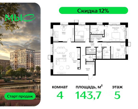 Прямая продажа от застройщика. Продаётся 4-комнатная квартира общей площадью 129.49 м² без отделки в премиальном жилом комплексе "МЫС" на 5-м этаже 12 этажного дома. Квартира расположена в корпусе "Сибирь". Проект МЫС — это, прежде всего, идеальное место для семей. В рамках проекта построят государственную школу, два детских сада и дворец спорта площадью 20 000 м2 с термальным комплексом, выплывным бассейном, фитнес-залом, теннисными, сквош и падел кортами и секциями для детей. На территории площадью, сравнимой с тремя парками Зарядье, появятся кафе и рестораны, пруд с набережной, спортивные и детские площадки, скейт-парк, лыжные и веломаршруты. Расположение: - 2 минуты до скоростной трассы М1 и Минского шоссе; - 10 минут до МКАД; - 15 минут до МЦД Лесной Городок - 20 минут до делового центра "Москва-Сити"; - 28 минут до аэропорта "Внуково". Благоустройство: - велосипедные и лыжные маршруты; - собственная набережная и парк; - лаунж-зоны в окружении природы; - беседки у очага; - дворец спорта площадью 20 000 м²; - термальный комплекс с тремя бассейнами; - 4 теннисных и падел-корта; - 6 сквош-кортов; - многофункциональный спортзал; - скейт-парк; - просторная площадь для прогулок с фонтаном; - детский Клуб с творческими секциями; - гастро-доминанта; - кафе у пруда, рестораны, ритейл. Окружение - соседство с лесным фондом; - школа на 1250 мест и 2 детских сада на 350 и 255 мест; - Дубковский и Подушкинский леса, парк "Рассказовка", Мещерский парк. Действуют специальные условия при 100% оплате, подробности уточняйте у менеджера в офисе продаж.