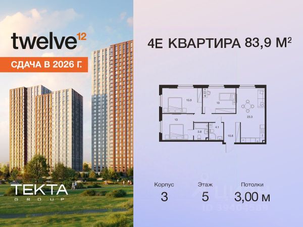 Рассрочка 0% с платежом от 120 000 ₽ в месяц. Сдача уже в 2026 году 4-комн. квартира в ЖК "Твелв" на 5 этаже в 28 этажном здании Корпус 3. Общая площадь: 83.9 кв.м., жилая: 57.50 кв.м. Высота потолков 3.00 м. ЖК Твелв от застройщика Текта Групп — это новый уровень жизни в районе Нагорный в 3-х минутах от станции метро. Проект представляет собой воплощение современной концепции комфортной жизни, где функциональность органично сочетается с эстетикой. Архитектура Твелв создает атмосферу, вдохновляющую на успех и располагающую к позитивным эмоциям. Дом, в котором каждый день будет наполнен уютом, а не рутинной работой и дорожными пробками. Твелв предлагает своим жильцам продуманные планировки, возможность объединения квартир, а также увидеть красоту города через угловое остекление увеличенных окон. Особое внимание уделено комфорту жителей: благоустроенная территория, зеленые насаждения, детские площадки, парковка. ЖК Твелв — это больше, чем просто жилье: это атмосфера умиротворенности, комфорта и гармонии.