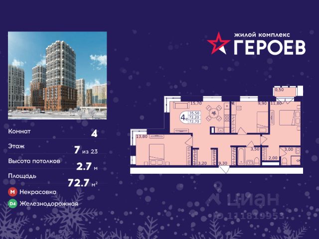 Продаётся 4-комнатная квартира в формате евро 72.70 кв. м. в жилом комплексе "Героев" в Балашихе, Железнодорожный. Квартира расположена на 7 этаже 610 корпуса. В наличии квартиры с отделкой. Всего 40 минут до центра Москвы. При покупке квартиры в сданном доме ключи выдаются сразу! Жилой квартал "Героев" - это уютный проект для семей с детьми. В квартале созданы все условия для досуга всех возрастов: игровые и спортивные площадки, места для отдыха и прогулочные зоны. За 15 минут можно дойти от дома до Ольгинского лесопарка, популярного места для отдыха на свежем воздухе. На территории жилого комплекса уже открыт детский сад на 250 мест и началось строительство еще одного - для 220 малышей, а также школы для 1320 учеников. Рядом работают магазины, кафе, супермаркеты, пункты выдачи. Преимущества: • В уютных светлых квартирах с просторными кухнями-гостиными удобно встречать гостей и проводить время наедине друг с другом. • Благодаря увеличенному остеклению в комнатах много света. • Квартиры продаются с отделкой, можно заселяться сразу после получения ключей.