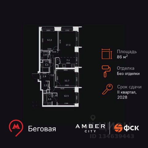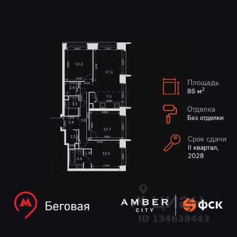 Прямая продажа от застройщика! Жилой Комплекс премиум-класса. Продаётся 4-к квартира номер 714 общей площадью 86 кв.м. на 7-м этаже 57 этажного здания. Без отделки. Цена с учётом скидки. Особенности квартиры: - Мастер-зона с санузлом и гардеробной. Всё для вашего комфорта и удобства, включая личный санузел и гардероб. - Просторная спальня, в которой можно разместить большую кровать. - Угловая планировка - больше пространства для ваших идей. - Увеличенная ширина окна/окон - больше света и визуального простора. - Увеличенное количество окон - дополнительное освещение и свежий воздух. - Нестандартное окно - особенный акцент в вашем интерьере. - Увеличенная высота окна - больше воздуха и света. - Панорамное окно - создайте атмосферу открытости и простора. - Гостевой санузел - комфорт и удобство для ваших гостей. - Душ помимо ванной - дополнительное удобство для вашей семьи. - Постирочная - организуйте пространство для стирки и сушки вещей. - Евроформат - просторное и удобное жилье с отличной планировкой. - Место для игры/занятия спортом - идеальное пространство для активных детей. - Можно оборудовать 2 или более рабочих места - пространство для нескольких человек. - Просторная мягкая зона - комфорт и уют для отдыха всей семьи. - Гардеробная - удобство для хранения и организации вещей. Информация о комплексе: Amber City - это не просто квартал. Это место, куда ведут все маршруты, где рождается вдохновение работать и творить, где счастлива семья и жизнь кипит 24/7. Модная архитектура, высокотехнологичные решения и самодостаточная инфраструктура приближают Amber City к лучшим районам Гонконга и Нью-Йорка. Потрясающие виды на Москва-Сити и центр позволяют заряжаться их амбициозностью, не подчиняясь суете. Стремящиеся ввысь небоскребы, благоустроенный парк с зонами отдыха для взрослых и детей, а также многочисленные объекты инфраструктуры возводятся в западной части центра Москвы. Транспортная доступность: Квартал отличается исключительной транспортной доступностью: большая часть значимых мест Москвы находится на расстоянии 15-20 минут. Такое расположение позволит полностью погрузиться в деловую и культурную жизнь столицы и тратить на дорогу только необходимый минимум времени. Общественный транспорт: - Станция метро "Беговая" - 5 минут пешком - Станция "Беговая" (МЦД-1) - 5 минут пешком - Ж/д станция Беговая - 12 минут пешком - Остановка "2-й Хорошёвский проезд" - 3 минуты пешком - Станция метро "Звенигородская" (строящаяся) - 10 минут пешком На автомобиле: - Звенигородское шоссе - 3 минуты - TTK - 5 минут - Хорошёвское шоссе - 9 минут - Садовое кольцо - 12 минут - Красная Пресня - 15 минут - Тверская - 20 минут - Серебряный бор - 8 минут - Строгинский затон - 8 минут - Москва-Сити - 10 минут - Кремль - 20 минут - Аэропорт Шереметьево - 40 минут Внутренняя инфраструктура: Умелая работа над ландшафтом позволила правильно зонировать многоуровневое пространство, общей площадью 6 гектаров, открывая раз