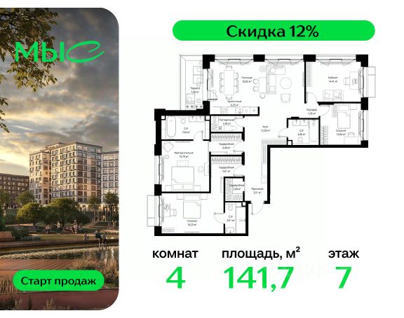 Прямая продажа от застройщика. Продаётся 4-комнатная квартира общей площадью 141.65 м² без отделки в премиальном жилом комплексе "МЫС" на 7-м этаже 12 этажного дома. Квартира расположена в корпусе "Сибирь". Проект МЫС — это, прежде всего, идеальное место для семей. В рамках проекта построят государственную школу, два детских сада и дворец спорта площадью 20 000 м2 с термальным комплексом, выплывным бассейном, фитнес-залом, теннисными, сквош и падел кортами и секциями для детей. На территории площадью, сравнимой с тремя парками Зарядье, появятся кафе и рестораны, пруд с набережной, спортивные и детские площадки, скейт-парк, лыжные и веломаршруты. Расположение: - 2 минуты до скоростной трассы М1 и Минского шоссе; - 10 минут до МКАД; - 15 минут до МЦД Лесной Городок - 20 минут до делового центра "Москва-Сити"; - 28 минут до аэропорта "Внуково". Благоустройство: - велосипедные и лыжные маршруты; - собственная набережная и парк; - лаунж-зоны в окружении природы; - беседки у очага; - дворец спорта площадью 20 000 м²; - термальный комплекс с тремя бассейнами; - 4 теннисных и падел-корта; - 6 сквош-кортов; - многофункциональный спортзал; - скейт-парк; - просторная площадь для прогулок с фонтаном; - детский Клуб с творческими секциями; - гастро-доминанта; - кафе у пруда, рестораны, ритейл. Окружение - соседство с лесным фондом; - школа на 1250 мест и 2 детских сада на 350 и 255 мест; - Дубковский и Подушкинский леса, парк "Рассказовка", Мещерский парк. Действуют специальные условия при 100% оплате, подробности уточняйте у менеджера в офисе продаж.
