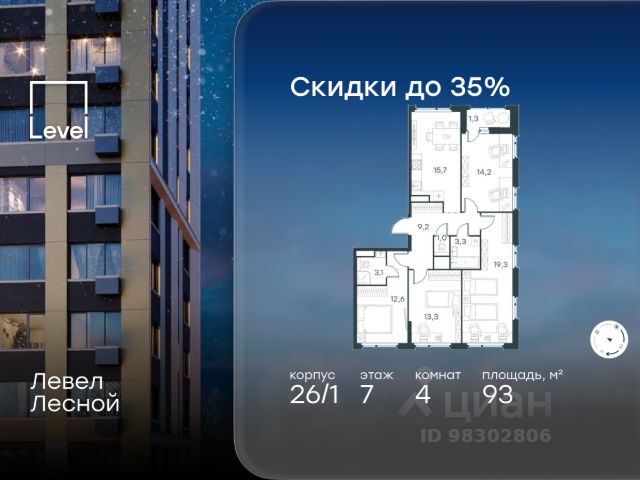 Цена указана с учётом скидки при 100%-й оплате, несубсидированной ипотеке, рассрочке (кроме программы "Рассрочка 0%"). В районе, утопающем в густой зелени лесов, многочисленных парков и скверов, продаётся 4-комнатная квартира площадью 93.00 кв.м с отделкой white box. Квартира расположена на 7 этаже в жилом комплексе комфорт-класса Левел Лесной (компания Level Group/Левел групп). Отличная транспортная доступность: - 25 мин. пешком до станции метро "Пятницкое шоссе"; - 28 мин. на автобусе до станции метро и МЦД-2 "Волоколамская"; - 11 мин. на авто до МКАД; - 25 мин. на авто до ТТК. Продуманный архитектурный проект: - Концепция проекта Левел Лесной от бюро СПИЧ; - Высотность комплекса до 15 этажей с уникальными видами на лесные массивы и город; - Высота потолков до 3 м; - Современные окна высотой до 1,6 м, в части квартир предусмотрены окна в пол. Высота подоконников 0,6 м; Расположение: Жилой комплекс Левел Лесной строится в зелёной зоне ближайшего Подмосковья, г.о. Красногорск в посёлке Отрадное. Шаговая и автомобильная доступность до метро и больших транспортных артерий города. За 25 минут вы дойдёте до станции метро "Пятницкое шоссе", а за 20 минут на машине сможете доехать до станции метро "Тушинская". Район окружен роскошной зеленью лесов и парковых зон, занимающих территорию свыше 1 000 гектаров. Помимо благоприятной экологии, здесь множество возможностей для активного отдыха и поддержания физической формы. Облагороженная территории с полностью развитой инфраструктурой. На территории проекта находится детский сад и школа "Светлые Горы", которая входит в список лучших частных школ от Forbes Education (по данным на 2023г.). Кроме того, в пешей доступности расположено ещё 8 детских садов, а также запланировано открытие современной муниципальной школы. В непосредственной близости находятся сетевые супермаркеты и локальные магазины, аптеки, клиники, почта, библиотека, салоны красоты, рестораны, спортивные и творческие секции, развивающие детские центры. В 12 минутах пешком расположен торговый парк "Отрада" с продуктовым и строительным гипермаркетами, магазинами, кинотеатром и развлечениями для детей. Внутренняя инфраструктура: Мы знаем, как важно, чтобы магазины и сервисы были всегда рядом. В сданных корпусах жилого комплекса Левел Лесной уже расположена полностью готовая развитая инфраструктура. На первых этажах корпуса 27 предусмотрено ещё 14 коммерческих помещений. Благоустройство: Продуманное пространство и аура приватного европейского городка рождают чувство лёгкости и расслабления у каждого, кто попадает на территорию проекта. Концепцию общественных площадок разработали в партнёрстве два архитектурных бюро: Highlight Architecture и SCAPE. В безопасных дворах без машин каждый обязательно найдёт себе место для вдохновения, отдыха и спорта.