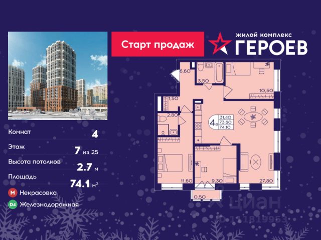 Продаётся 4-комнатная квартира в формате евро 74.10 кв. м. в жилом комплексе "Героев" в Балашихе, Железнодорожный. Квартира расположена на 7 этаже 611 корпуса. В наличии квартиры с отделкой. Всего 40 минут до центра Москвы. При покупке квартиры в сданном доме ключи выдаются сразу! Жилой квартал "Героев" - это уютный проект для семей с детьми. В квартале созданы все условия для досуга всех возрастов: игровые и спортивные площадки, места для отдыха и прогулочные зоны. За 15 минут можно дойти от дома до Ольгинского лесопарка, популярного места для отдыха на свежем воздухе. На территории жилого комплекса уже открыт детский сад на 250 мест и началось строительство еще одного - для 220 малышей, а также школы для 1320 учеников. Рядом работают магазины, кафе, супермаркеты, пункты выдачи. Преимущества: • В уютных светлых квартирах с просторными кухнями-гостиными удобно встречать гостей и проводить время наедине друг с другом. • Благодаря увеличенному остеклению в комнатах много света. • Квартиры продаются с отделкой, можно заселяться сразу после получения ключей.