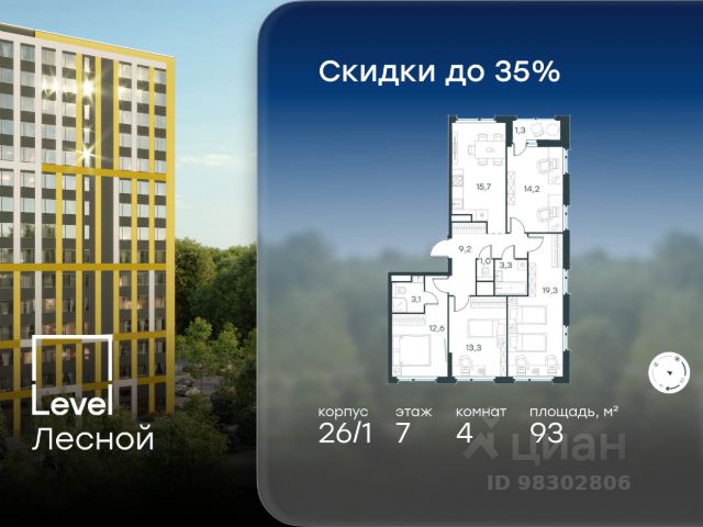 Цена указана с учётом скидки при 100%-й оплате, несубсидированной ипотеке, рассрочке (кроме программы "Рассрочка 0%"). В районе, утопающем в густой зелени лесов, многочисленных парков и скверов, продаётся 4-комнатная квартира площадью 93.00 кв.м с отделкой white box. Квартира расположена на 7 этаже в жилом комплексе комфорт-класса Level Лесной (компания Level Group/Левел групп). Отличная транспортная доступность: - 25 мин. пешком до станции метро "Пятницкое шоссе"; - 28 мин. на автобусе до станции метро и МЦД-2 "Волоколамская"; - 11 мин. на авто до МКАД; - 25 мин. на авто до ТТК. Продуманный архитектурный проект: - Концепция проекта Level Лесной от бюро СПИЧ; - Высотность комплекса до 15 этажей с уникальными видами на лесные массивы и город; - Высота потолков до 3 м; - Современные окна высотой до 1,6 м, в части квартир предусмотрены окна в пол. Высота подоконников 0,6 м; Расположение: Level Лесной строится в зелёной зоне ближайшего Подмосковья, г.о. Красногорск в посёлке Отрадное. Шаговая и автомобильная доступность до метро и больших транспортных артерий города. За 25 минут вы дойдёте до станции метро "Пятницкое шоссе", а за 20 минут на машине сможете доехать до станции метро "Тушинская". Район окружен роскошной зеленью лесов и парковых зон, занимающих территорию свыше 1 000 гектаров. Помимо благоприятной экологии, здесь множество возможностей для активного отдыха и поддержания физической формы. Облагороженная территории с полностью развитой инфраструктурой. На территории проекта находится детский сад и школа "Светлые Горы", которая входит в список лучших частных школ от Forbes Education (по данным на 2023г.). Кроме того, в пешей доступности расположено ещё 8 детских садов, а также запланировано открытие современной муниципальной школы. В непосредственной близости находятся сетевые супермаркеты и локальные магазины, аптеки, клиники, почта, библиотека, салоны красоты, рестораны, спортивные и творческие секции, развивающие детские центры. В 12 минутах пешком расположен торговый парк "Отрада" с продуктовым и строительным гипермаркетами, магазинами, кинотеатром и развлечениями для детей. Внутренняя инфраструктура: Мы знаем, как важно, чтобы магазины и сервисы были всегда рядом. В сданных корпусах Level Лесной уже расположена полностью готовая развитая инфраструктура. На первых этажах корпуса 27 предусмотрено ещё 14 коммерческих помещений. Благоустройство: Продуманное пространство и аура приватного европейского городка рождают чувство лёгкости и расслабления у каждого, кто попадает на территорию проекта. Концепцию общественных площадок разработали в партнёрстве два архитектурных бюро: Highlight Architecture и SCAPE. В безопасных дворах без машин каждый обязательно найдёт себе место для вдохновения, отдыха и спорта.