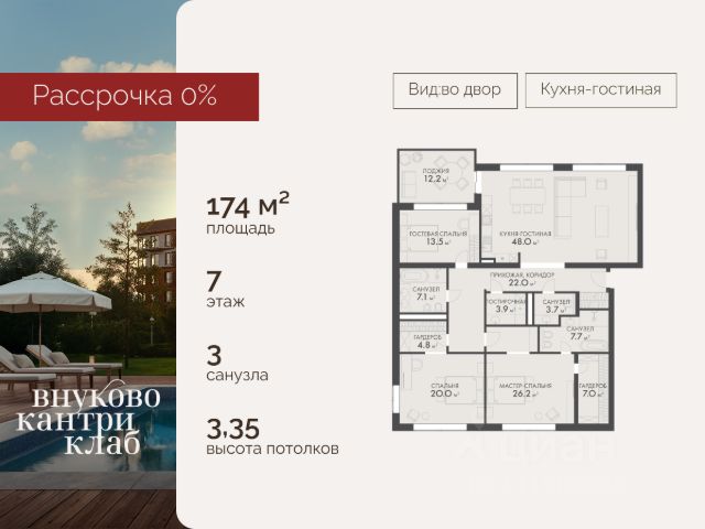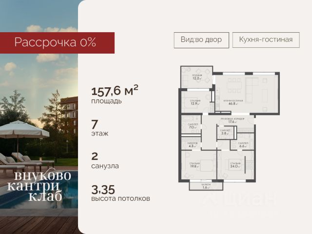 Продается видовая квартира (площадь - 158.20 кв. м., комнат - 4, этаж 7) в клубном поселке премиум-класса Vnukovo Country Club. Комплекс расположен на Западе Москвы в экологически-чистом районе в окружении Ульяновского и Валуевского лесопарков. 30 Га зеленой территории с ландшафтным дизайном, пешеходными и вело-маршрутами, озером и рекой. На закрытой территории комплекса более 10 объектов собственной инфраструктуры: * Подогреваемый открытый и крытый бассейны; * Многофункциональный спортивный комплекс с более 20 видами спорта; СПА-центр; Школа, детский сад, более 40 различных кружков и секций; Досуговый центр с коворкингом, библиотекой и кинозалом Семейный ресторан VESNA с приватным клабхаусом для работы, отдыха и общения резидентов жилого комплекса * Торговая галерея с премиальным супермаркетом, пекарней, аптекой и химчисткой * Приватный парк с лаунж-зонами и др. Уникальной особенностью комплекса является вертикальное озеленение фасадов и просторные видовые террасы. Квартиры во Vnukovo Country Club предлагаются с различными вариантами отделки и без нее, а также доступна опция полной меблировки - такие квартиры полностью готовы к проживанию. Расположение: * 5 мин. до МЦД-4 "Санино"; * 15 мин. до аэропорта "Внуково"; * 20 мин. до МКАД по Киевскому шоссе; * 35 мин. до "Москва-Сити" За подробной консультацией обращайтесь по телефону.