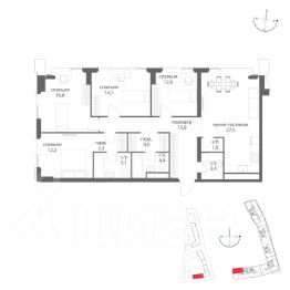 Спланированы просторная кухня-гостиная с 4 окнами на 2 стороны света, хозяйская спальня со своей гардеробной комнатой, детская спальня с гардеробной, кабинет/гостевая спальня, 2 больших ванные комнаты, постирочно-гладильная, также есть лоджия с панорамным остеклением. Высота дверей - 2,50 метра. За дополнительную цену к квартире можно купить большое и удобное м/место в подземном паркинге, ширина места 2,85 метра.