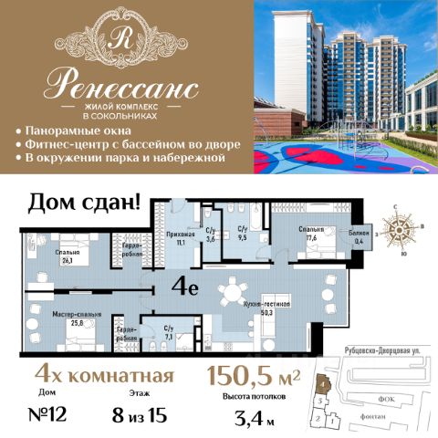 Жилой комплекс премиум-класса "Ренессанс" расположен на Рубцовско-Дворцовой улице старинного района Сокольники, в нескольких минутах ходьбы от знаменитого парка "Сокольники" - самого большого парка Москвы и одного из крупнейших в Европе, где круглый год можно прекрасно проводить время всей семьей. Из панорамных окон премиального бренда Schuco открываются завораживающие виды на сияющие в лучах солнца купола церквей и храмов, изумрудную зелень легендарного парка "Сокольники" и национального парка "Лосиный остров", излучины реки Яузы с величественной гранитной набережной, старинные здания, среди которых дворец императрицы Елизаветы Петровны, небоскребы "Москва-Сити", Останкинскую телебашню и приватную, охраняемую территорию комплекса с концепцией "двор без машин", изысканным ландшафтным дизайном, богатой коллекцией растений, пространствами для отдыха с роскошным фонтаном с красивой подсветкой, элегантной перголой, большими шахматами, детскими городками и спортивными площадками. Роскошный интерьер лобби: натуральный испанский мрамор, вертикальный фонтан, репродукции картин эпохи Возрождения, великолепная итальянская люстра ручной работы с подвесками из хрусталя CutCrystal и муранского стекла, иранские ковры и дизайнерская мебель. Лифты премиум-класса ThyssenKrupp. Консьерж-сервис. На этажах мусорокамеры закрытого типа. Из квартиры можно связаться с консьержем по видеодомофону британской компании BAS-IP. Уникальная транспортная доступность: 5 мин. на авто - до ТТК и Русаковской эстакады; 10 мин. - до Садового кольца и улицы Земляной Вал; 15 мин. - до Кремлевской набережной. В шаговой доступности - ст. м. и БКЛ "Сокольники" и "Электрозаводская". Развитая собственная инфраструктура: подземный паркинг, здание фитнес-центра с бассейнами, объекты торговли и сферы услуг. Отличная инфраструктура респектабельного района Сокольники: детские сады, элитные общеобразовательные, музыкальные и спортивные школы, ТЦ, рестораны, банки.