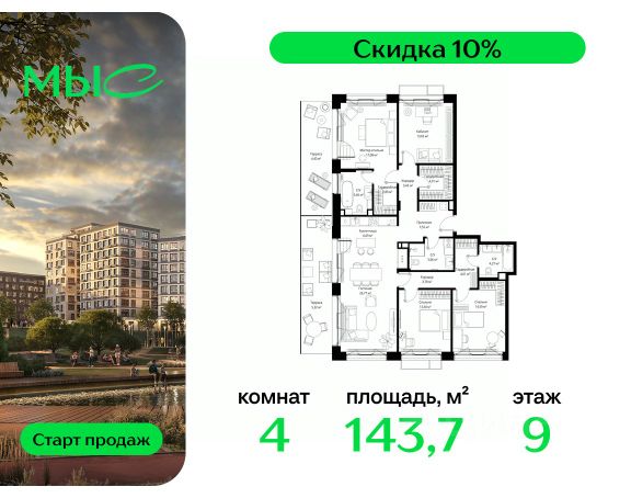Прямая продажа от застройщика. Продаётся 4-комнатная квартира общей площадью 143.73 м² без отделки в премиальном жилом комплексе "МЫС" на 9-м этаже 12 этажного дома. Квартира расположена в корпусе "Сибирь". Проект МЫС — это, прежде всего, идеальное место для семей. В рамках проекта построят государственную школу, два детских сада и дворец спорта площадью 20 000 м2 с термальным комплексом, выплывным бассейном, фитнес-залом, теннисными, сквош и падел кортами и секциями для детей. На территории площадью, сравнимой с тремя парками Зарядье, появятся кафе и рестораны, пруд с набережной, спортивные и детские площадки, скейт-парк, лыжные и веломаршруты. Расположение: - 2 минуты до скоростной трассы М1 и Минского шоссе; - 10 минут до МКАД; - 15 минут до МЦД Лесной Городок - 20 минут до делового центра "Москва-Сити"; - 28 минут до аэропорта "Внуково". Благоустройство: - велосипедные и лыжные маршруты; - собственная набережная и парк; - лаунж-зоны в окружении природы; - беседки у очага; - дворец спорта площадью 20 000 м²; - термальный комплекс с тремя бассейнами; - 4 теннисных и падел-корта; - 6 сквош-кортов; - многофункциональный спортзал; - скейт-парк; - просторная площадь для прогулок с фонтаном; - детский клуб с творческими секциями; - гастро-доминанта; - кафе у пруда, рестораны, ритейл. Окружение - соседство с лесным фондом; - школа на 1250 мест и 2 детских сада на 350 и 255 мест; - Дубковский и Подушкинский леса, парк "Рассказовка", Мещерский парк. Действуют специальные условия при 100% оплате, подробности уточняйте у менеджера в офисе продаж.
