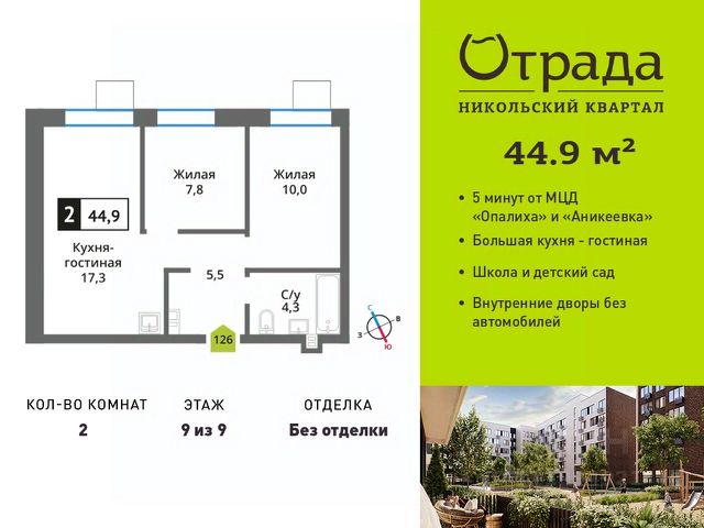 Двухкомнатная квартира (евротрешка) с просторной кухней-гостиной Двухкомнатная квартира (евротрешка) с просторной кухней-гостиной в жилом комплексе комфорт-класса "Никольский квартал Отрада". Планировка выполнена по современным стандартам и отличается повышенным комфортом. Квартал расположен в удачной локации, которая сочетает благоприятную экологическую обстановку с прекрасной транспортной доступностью. Проектом предусмотрены 14 корпусов высотой 6-9 этажей, а также муниципальная школа, один муниципальный и один частный детский сад, два наземных многоуровневых паркинга с кладовыми помещениями. Надежный застройщик ГК "Отрада" с высочайшим рейтингом 5 звезд от портала ЕРЗ. Все корпуса во всех ЖК сданы раньше срока!