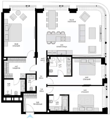 мастер-спальня со своим санузлом (душевая) и гардеробной комнатой;