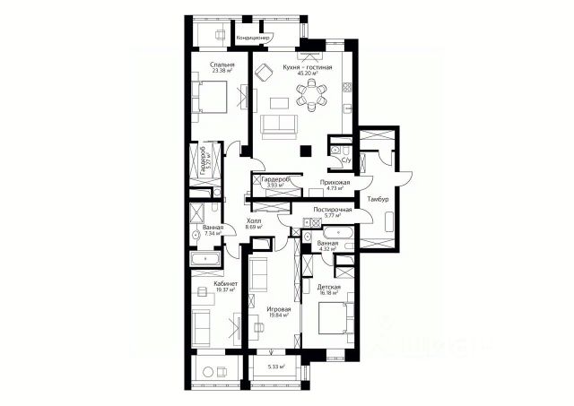 Выполнена по дизайн-проекту в американском стиле, полностью меблирована, 4-комнатная квартира, их которых 3 изолированные комнаты с вместительными гардеробными и огромную зону гостиной с зоной столовой около 40 кв. м., изолированную кухню 14 кв.м., 2 санузла (один в мастер-спальне и гостевой санузел с душевой кабиной). Комнаты на все стороны-двор, парк, Рублевское шоссе, потолки 3.10 и 3м. Огромные окна из лиственницы, дубовый паркет Версаль отменного качества, деревянные эксклюзивные французские двери, французская, немецкая и американская мебель из массива дерева, встроенная мебель на заказ, люстры, оригинальные светильники и хрусталь Ralph Lauren, уникальная высокохудожественная лепнина и кесонные потолки, мраморные подоконники и столешницы в санузлах. Имеет приточную вентиляцию и независимую систему кондиционирования в каждом помещении. Идеальна для семьи с одним или двумя детьми, с детской комнатой, имеющей библиотеку в мансардной зоне второго этажа и меловой стеной. Перепланировка согласована.