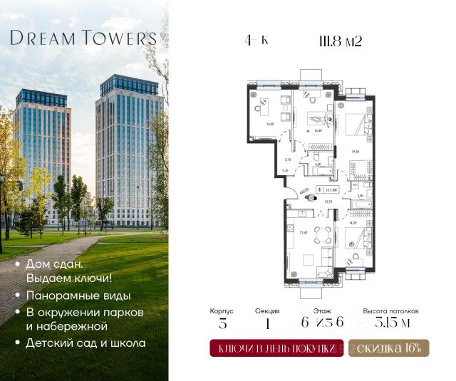 Квартира в премиальном квартале Dream Riva — первая линия Москвы-реки Продается квартира в прибрежном квартале Dream Riva на территории курортной локации "Остров мечты". 87.9 кв.м, 4 комнат, 4 этаж. Высота потолков 3,1 м. Жемчужная коллекция • Угловые панорамные окна на 270 — редкий формат для проекта • Квартиры с идеальными видом на воду • Мастер-спальня с гардеробной • Естественный свет в гостиной с двух сторон ЛОКАЦИЯ И ТРАНСПОРТ • 15 минут на авто до Садового кольца, • 30 минут до Москва-Сити и Кремля. • 10 минут до метро "Технопарк" в пешей доступности. В перспективе — станция "Остров мечты" (2028г.). ИНФРАСТРУКТУРА КВАРТАЛА • 3 Га приватного двор-парка с зонами для спорта, йоги и отдыха; • Благоустроенная набережная с гастропроменадом; • Клубные лобби с инфраструктурой; • Премиум SPA-центр с бассейном и фитнес-клуб; • Государственный детский сад под окном и школа в 10 минутах от квартала; • Подземный и гостевой паркинг. ПРИВИЛЕГИИ РЕЗИДЕНТОВ • Пляжный клуб Dream Beach Club; • Яхт-клуб Dream Marine Resort; • Вейк-клуб; • Парк развлечений "Остров мечты"; • 44 Га парков для прогулок и спорта в окружении квартала. БЕЗОПАСНОСТЬ И КОМФОРТ • Приватная территория; • Охрана; • Видеонаблюдение; • Консьерж-сервис 24/7; • Современные инженерные системы и технологии умного дома. НАДЕЖНЫЙ ЗАСТРОЙЩИК Regions Development — успешная девелоперская компания. За 20 лет работы реализовали уже более 30 проектов в сегментах коммерческой и многофункциональной недвижимости. Скидки действуют только при 100% оплате и ипотеке Скидки действуют только при 100% оплате, ипотеке и рассрочке. Скидки и акции не суммируются. Звоните, чтобы договориться о просмотре!