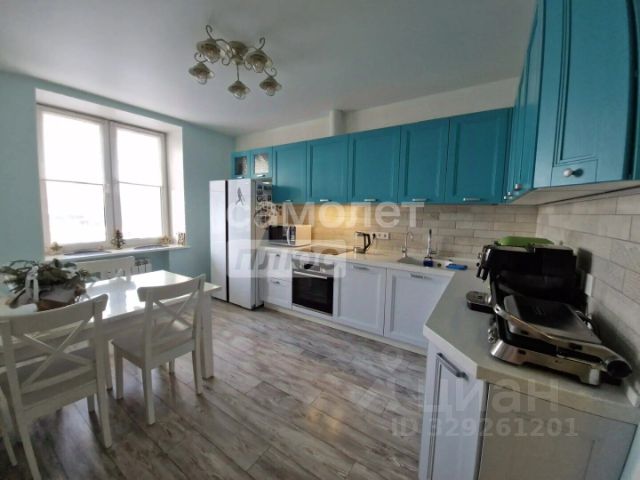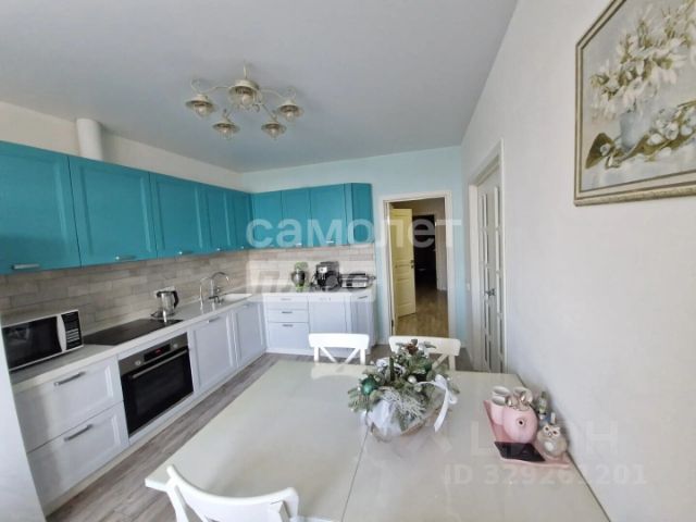 На кухне располагается угловой кухонный гарнитур, выполненный на заказ. Большое количество пространства для хранения, вместительные выдвижные ящики с металлическим каркасом, колонна под встроенный духовой шкаф (Zigmund & Shtain, сенсорный), ниша под холодильник (LIEBHERR), посудомоечная машина, удобная варочная панель нестандартных габаритов (Zigmund & Shtain, сенсорная), монолитная столешница из искусственного камня с интегрированной раковиной, фильтр для воды. Также, на кухне расположена обеденная зона и выход на лоджию, объединяющую два помещения.