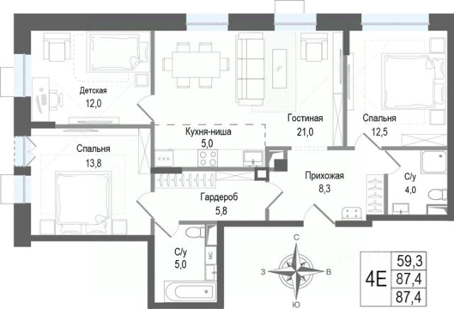 Продаётся 4-комнатная квартира в строящемся доме (Корпус 3), срок сдачи: II-кв. 2027, общей площадью 86.2 кв.м., на 4 этаже. ЖК "Киноквартал" , МО, г. Королев, мкр. Первомайский, ул. Солнечная, д. 2