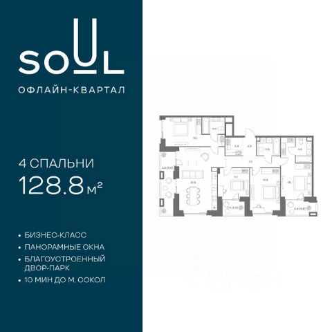 Цены указаны с условием 100% оплаты и стандартной ипотеки. Прямая продажа от застройщика! Продается 4-к. квартира номер 212 общей площадью 128.8 кв.м. на 5-м этаже 9 этажного дома, корпус UNIQUE (премиум-класс). Без отделки. Проект бизнес-класса SOUL от девелопера FORMA. До метро Сокол 10 мин пешком. Архитектура от британского бюро SimpsonHaugh. Благоустройство дворов — Gillespies и GAFA. Территория состоит из культурного парка и приватных дворов. Озеленение в эстетике лесного оазиса. Насыщенное благоустройство: прогулочные тропинки, релакс-зоны, пряный и сенсорный сады, развивающие детские площадки и воркауты. В центре проекта объект культурного наследия — общественное пространство Изофабрика, построенная в 30-х годах по проекту архитектора Георгия Гольца. Здесь будут располагаться мастерские для взрослых и детей, выставочные залы, коворкинги, образовательный центр, рестораны и кафе. Квартиры с панорамными окнами, мастер-спальнями, гардеробными, классическими балконами и лоджиями, видовыми террасами. Высота потолков от 2,9 до 3,5 м. В проекте 2 детских сада на 100 и 200 малышей. Клубная гостиная, фитнес-рум, детская игровая комната, дизайнерские лобби, подземный паркинг и келлеры. Продается 4-комнатная квартира в районе Аэропорт в Москве.