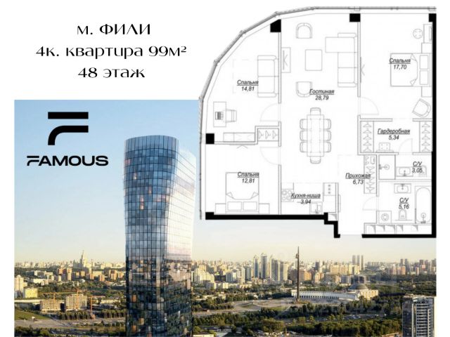 Видовой пентхаус 160,3 м² с террасой в комплексе "Фили Парк" на западе Москвы. Благодаря панорамным окнам с высоты 17 этажа открываются завораживающие виды на "Москву-Сити", Парк Победы и Живописный мост. Планировка: просторная кухня-гостиная с выходом на обогреваемую террасу с уличной мебелью B&B Italia. Мастер-спальня со своей ванной комнатой с окном и гардеробом, вторая спальня, кабинет, ванная комната, гостевой санузел, постирочная. Установлена современная система "умный дом" KNX, система кондиционирования и вентиляции, тёплые полы, электрофурнитура премиум-класса Ekinex. Сантехника от Antonio Lupi, Agape, Zender.Дизайнерское решение интерьера с отделкой из натурального мрамора Pietra Grey и Iceberg, массива тика, декоративного бетона и кожаных фасадов. Натуральные напольные покрытия из массива дерева кумару и мрамора. Каждая деталь продумана до мелочей, чтобы обеспечить высочайший уровень комфорта и эстетического наслаждения. Пентхаус полностью укомплектован мебелью от Baxter, В&B Italia, Minotti, Cattelan Italia, Flos, Poliform. Интерьер украшен картинами Victoria Rs, аксессуарами от Bagong Ball Gallery, Flinstone Bali, Poltrona Frau. Кухня и стеллажи выполнены по индивидуальному заказу. Откройте для себя мир безупречного комфорта и изысканного стиля. Главное о доме. "Фили Парк" — 19-этажный клубный дом бизнес-класса в районе Филёвский парк с фасадом из серого керамогранита. В лобби с восьмиметровыми потолками вас встречает консьерж, гостей принимаете у стойки ресепшн. В квартирах панорамное остекление и потолки 3,1 метра — пространство наполнено воздухом и светом. Можно выбрать компактную студию или двухуровневые варианты с террасами. Территория закрыта и охраняется, во дворе оборудованы детские и спортивные площадки. Машину оставляете в подземном паркинге на 140 мест или на гостевой наземной стоянке. В стилобате работают магазины и кафе — всё необходимое под рукой. Главное о локации. До метро "Фили" 2 минуты пешком. За 5 минут доходите до ТРЦ "Филион": здесь принято поужинать с семьёй в ресторане или зайти за покупками. Выходные проводите в парке "Фили" — 15 минут неспешным шагом. Ребёнка отводите в школу 72 или гимназию 1567. Выезд на Кутузовский проспект и ТТК занимает пару минут, до "Москва-Сити" — 10 минут на машине. В фитнес-центр Alex Fitness заходите после работы прямо по пути домой. Комментарий эксперта. Меня зовут Эльвира Стороженко — брокер компании Whitewill. Я отвечаю за продажу этого лота. Свяжитесь со мной, чтобы получить расширенную презентацию, больше фотографий или договориться о просмотре. Могу провести экскурсию по локации и познакомить вас с этим домом. ID 330 790. Продам 4-комнатную квартиру на проезде Багратионовский в Москве.