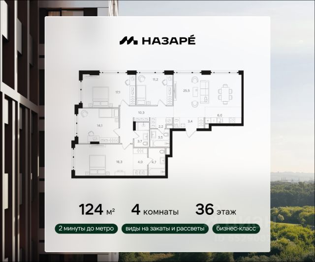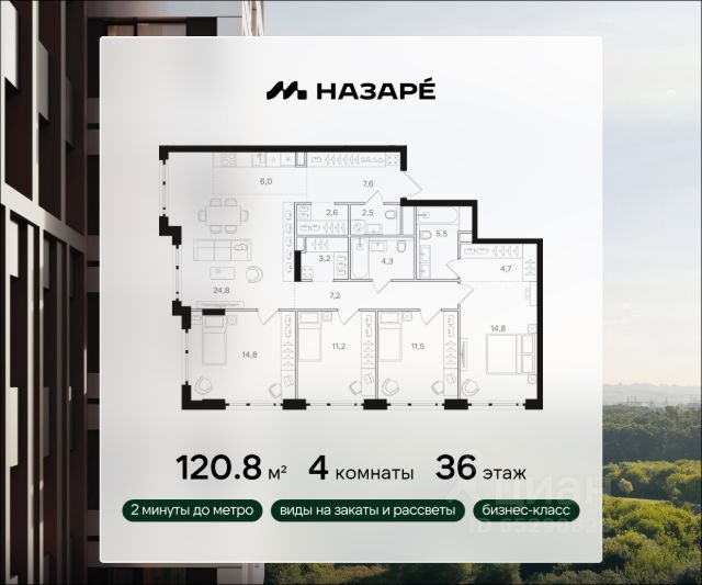 Продается 4-комнатная квартира в ЖК "НАЗАРЕ'" Общая площадь - 120.80 Тип дома - монолитный Этаж - 36 Год сдачи - 2028 Предлагается квартира площадью 120.80 кв. м в новом современном квартале на востоке Москвы, прямо у станций метро и МЦК "Бульвар Рокоссовского". Квартира располагается в корпусе 5 на 36 этаже комплекса бизнес-класса "НАЗАРЕ'". Великолепная транспортная доступность: • 2 минуты ходьбы до метро и МЦК "Бульвар Рокоссовского"; • 3 минуты на авто - удобный выезд на СВХ (МСД); • 10 минут на авто до национального парка "Лосиный остров"; • 10 минут на авто до "Измайловского парка"; • 15 минут до авто до парка "Сокольники"; • 15 минут занимает выезд на ТТК, • 18 минут на авто до Садового кольца. Индивидуальная архитектура в современном стиле: • шесть башен переменной высотности от 24 до 43 этажей, в том числе одна высотная 143-метровая доминанта, которая станет достопримечательностью востока Москвы; • авторы архитектурной концепции - знаменитое бюро СПИЧ (среди их работ - башня "Федерация", новое здание Третьяковской галереи, реконструкция БСА "Лужники" и др.); • торгово-развлекательный комплекс с фитнес-центром, детской игровой комнатой и открытыми террасами прямо возле квартала; • дизайнерские лобби от бюро ABOVE ARCHITECTURE с панорамными окнами, интерьерами в теплой цветовой гамме и мягкой зоной ожидания располагаются в каждой башне; • корпуса расположены так, чтобы из окон открывались потрясающие виды на закаты и рассветы, зеленые панорамы или огни мегаполиса; Особенности расположения "НАЗАРЕ'" находится максимально близко к метро, и в то же время проект вписан в уже существующую инфраструктуру зеленого столичного района Богородское. Это обеспечивает быстрый доступ ко всем нужным объектам инфраструктуры (детские сады, школы, медцентры, магазины, салоны красоты, фитнес-клубы, футбольные поля, спортивные школы), а также к живописным зеленым зонам - национальному парку "Лосиный остров", парку "Сокольники", Черкизовскому детскому парку, Измайловскому лесопарку с усадьбой Измайлово. Собственная инфраструктура и благоустройство Шесть башен квартала будут объединены цокольным этажом, в который можно попасть как с улицы, так и со стороны лобби. Здесь разместятся необходимые для комфортной повседневной жизни кофейни, супермаркет, рестораны, магазины и многое другое. В комплексе предусмотрен вместительный двухуровневый подземный паркинг с келлерами для хранения сезонных вещей. Во дворе комплекса "НАЗАРЕ'" будут места как для спокойного отдыха и работы, так и для игр и спорта. Здесь организованы игровые площадки для детей всех возврастов, места для стритбола и тенниса, а также зона с природным ландшафтом и коворкинг с экологичной деревянной мебелью. 4-комнатная квартира в районе Богородское в Москве.