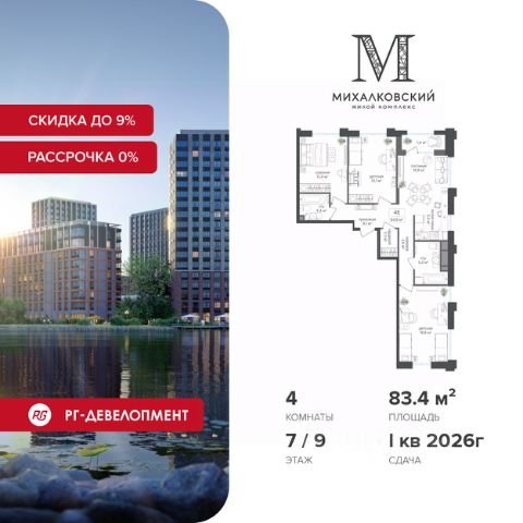 Ипотека для каждого! Полная стоимость кредита от 11,578% до 22,490%. Ставка от 0,11% в АО "Альфа-Банк" фиксируется на 1 год с даты заключения кредитного договора, далее полная стоимость кредита от 25,819% до 28,767% ставка 21,59% до окончания срока кредитования. Первоначальный взнос — от 20% от стоимости квартиры. Срок кредитования — от 3 до 30 лет. Скидка 9% при покупке квартиры! Продаётся 4-к квартира 85,0 кв.м. в ЖК "Михалковский" на 8-м этаже 20 этажного дома. Компания "РГ-Девелопмент" предоставляет скидки на квартиры в жилом комплексе. Акция действительна с 12.09.2024 г. до 31.10.25г. включительно. Для того чтобы воспользоваться предложением, необходимо подписать договор на приобретение недвижимости до 31.10.25г., включительно. Рассрочка 0% + Скидка 5%. При приобретении дольщиком квартиры в любом из двух данных корпусов с использованием способа оплаты "Рассрочка 0%", у покупателя также есть право воспользоваться скидкой в размере 5% от полной стоимости квартиры. Условия программы рассрочки: Первый платеж составляет 20% от стоимости объекта и вносится при заключении ДДУ. Второй платеж в размере 20% от стоимости объекта вносится по истечении 12 месяцев со дня подписания ДДУ. Оставшаяся сумма, в размере 60%, выплачивается за месяц до планового срока ввода ЖК в эксплуатацию, то есть не позднее 31.05.2027. Действует на приобретение квартир в корп. 2, 7. Действует программа "Растет семья - растет и квартира". Прямая продажа от застройщика! Старт продаж новых корпусов. Квартиры без отделки. Срок сдачи IV кв. 2027г. Особенности проекта: Завораживающие виды Красивое благоустройство Уникальная локация для Москвы (рядом Головинский парк, пруды, усадьба Михалково) Рядом с центром В проекте присутствует: архитектура голландского бюро MLA+, зеленые зоны, транспортная доступность, благоустроенная территория, подземный паркинг, детский сад и выход на Головинский парк с пятью прудами. Название комплекса указывает на одну из его черт - соседство с имением Михалково. Позвольте себе жить в месте, где проводили свой досуг династии Дашковых и Паниных. Продам 4-комнатную квартиру в районе Головинский в Москве.
