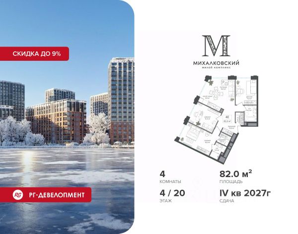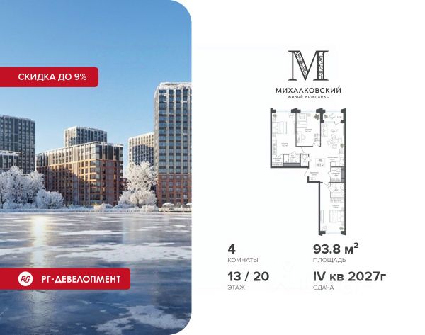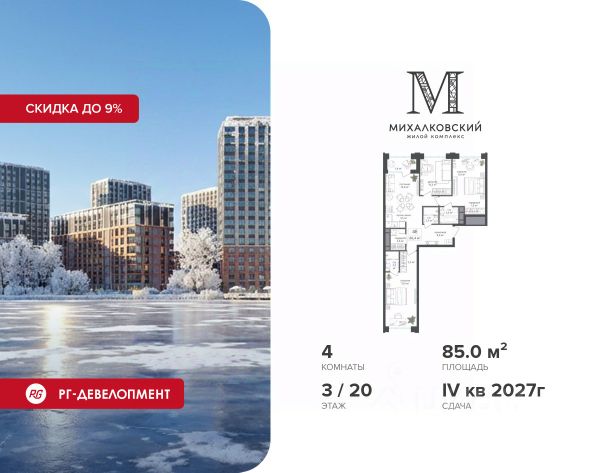 Скидка 9% при покупке квартиры! Продаётся 4-к квартира 85,0 кв.м. в ЖК "Михалковский" на 3-м этаже 20 этажного дома. Ипотека для каждого! Полная стоимость кредита от 13,192% до 17,149%. Ставка от 0,11% в АО "Альфа-Банк", ген. лицензия ЦБ РФ 1326 от 16.01.2015. Ставка фиксируется на первые 12 месяцев, далее полная стоимость кредита от 22,022% до 24,599% ставка 21,59%. Первоначальный взнос — от 20,1% от стоимости квартиры. Срок кредитования — от 4 до 30 лет. Компания "РГ-Девелопмент" предоставляет скидку на квартиры в жилом комплексе. Акция действительна до 15.03.2026 включительно. Для того чтобы воспользоваться предложением, необходимо подписать договор на приобретение недвижимости до 15.03.2026 включительно. Действует программа "Растет семья - растет и квартира". Компания "РГ-Девелопмент" вошла в ТОП-10 девелоперов по объёму введённого жилья в "Старой Москве" по итогам 2025 года. Прямая продажа от застройщика! Квартиры без отделки. Срок сдачи IV кв. 2027г. Особенности проекта: Завораживающие виды Красивое благоустройство Уникальная локация для Москвы (рядом Головинский парк, пруды, усадьба Михалково) Рядом с центром В проекте присутствует: архитектура голландского бюро MLA+, зеленые зоны, транспортная доступность, благоустроенная территория, подземный паркинг, детский сад и выход на Головинский парк с пятью прудами. Название комплекса указывает на одну из его черт - соседство с имением Михалково. Позвольте себе жить в месте, где проводили свой досуг династии Дашковых и Паниных. Продам 4-комнатную квартиру в районе Головинский в Москве.