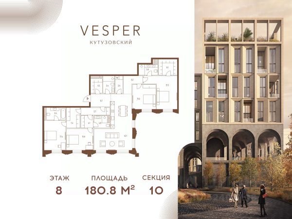 Продается 4-комнатная квартира без отделки, в корпусе 8.2 общей площадью 228 кв.м. на 15 этаже. Знаковый проект для ценителей комфортной городской среды от Vesper. Квартал площадью 3,7 га расположен на Кутузовском проспекте и воплощает новую концепцию идеально сбалансированного места для жизни. Благодаря удачному расположению и развитой транспортной инфраструктуре отсюда одинаково быстро добираться как до Кремля и ММДЦ "Москва-Сити", так и до Рублево-Успенского шоссе. Планировочные решения проекта Vesper Кутузовский включают широкую линейку жилых форматов и подойдут для самых взыскательных резидентов: помимо базовых вариантов квартир доступны эксклюзивные лоты — пентхаусы с террасами и квартиры с патио. Продуманная приватная инфраструктура, собственный ландшафтный парк, близость магазинов и ресторанов делают Vesper Кутузовский достойным выбором для самых взыскательных клиентов: как для тех, кто любит уединение, так и для резидентов, которые стремятся быть в центре событий. Концепция жилого квартала разработана ODA Architecture. Разная высотность 10 строений, плавные линии и главный паттерн из арок, размер которых меняется в зависимости от дома и этажа, создают визуальный ритм квартала и делают его легким и элегантным, наполненным солнечным светом и воздухом. Продается 4-комнатная квартира на проспекте Кутузовский в Москве.