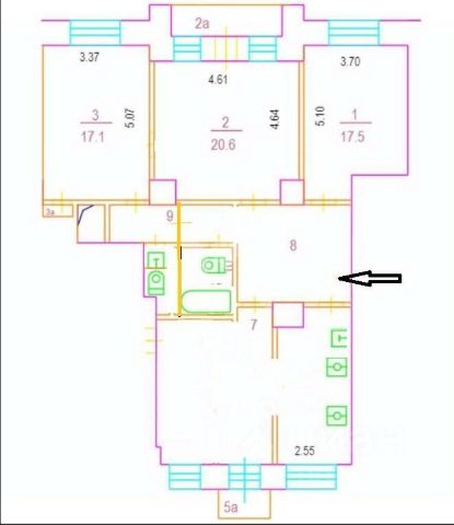 4)душевая комната 3,8 кв.м. с мраморной столешницей, раковиной, душевой кабиной и туалетом;