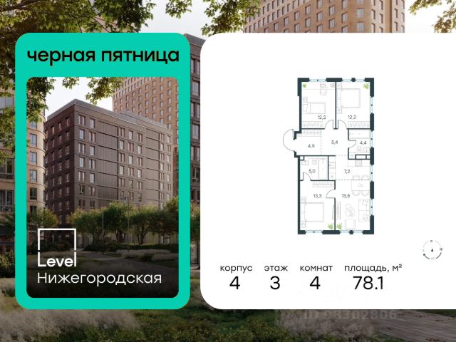 Цена указана с учётом скидки. В активно развивающемся районе на юго-востоке столицы продается 4-комнатная квартира площадью 78,8 кв.м без отделки.. Квартира расположена на 7 этаже 11-этажного этажного корпуса Корпус 4 в жилом комплексе комфорт-класса Level Нижегородская (компания Level Group/Левел групп). Отличная транспортная доступность - 10 мин. пешком до станции метро, МЦД-4, БКЛ и МЦК "Нижегородская"; - 13 мин. пешком до станций метро "Андроновка" и "Перово"; - 10 мин. на авто до ТТК; - 14 мин. на авто до Садового кольца. Благоустройство Благоустроенная территория комплекса делится на внешнюю и внутреннюю. Внутренняя часть представляет собой закрытый двор 0,9 га, где обустраиваются детские площадки для разных возрастных групп, беседки для отдыха и работы, несколько спортивных зон, включая воркаут-зоны и лужайку для бадминтона. Здесь же появится ухоженный луг с прогулочными маршрутами. Рядом с жилым комплексом Level Нижегородская будет создан ландшафтный парк площадью 2,4 га. В парке будут высажены вечнозеленые деревья, луговые травы и кустарники, благоустроены лаунж-пространства у пруда, дорожки для бега и прогулок. В центре парка предусмотрена событийная площадь, рядом расположатся дополнительные спортивные и детские площадки, также продумана зона для выгула домашних питомцев. Внутренняя инфраструктура Дома жилого комплекса будут оснащены коммерческими помещениями, где откроются все необходимые сервисы: магазины, аптеки, салоны красоты, кофейни, службы доставки и многое другое. Комфорт - это когда всё рядом. Кроме того, на территории Level Нижегородская предусмотрен подземный отапливаемый паркинг. Этап 1 включает 335 машино-мест и 143 кладовых помещения для хранения сезонных вещей. Технологии и безопасность Внутри домов и на территории двора предусмотрен высокоскоростной Wi-Fi, также в общественных зонах постоянно ведется видеонаблюдение. Подъезды, паркинг и внутренний двор оснащены системой контроля доступа. Для удобства жителей создано мобильное приложение, позволяющее связаться с управляющей компанией, осуществлять удаленное управление видеодомофоном или просмотреть изображение отдельных видеокамер по заявке. Для безопасного перемещения по этажам и комфортного спуска в паркинг предусмотрено современное лифтовое оборудование от компании BLT Brilliant Elevator. В корпусах будет установлено от 2 до 4 лифтов, включая сервисный. Скорость лифтов - 1,6 - 2,5 м/с. Особенности - Архитектура от экспертов из бюро ARCH(E)TYPE; - Разноуровневая застройка - от секций средней этажности до высоток в 45 этажей (этап 1); - Окна шириной до 2,2 метров (этап1) с видами на Останкинскую башню, Измайловский парк, "Москва-Сити" и Кусковский лесопарк; - Лобби площадью до 83 кв. м с окнами в пол и потолками от 3,4 метров, оснащенные мягкими лаундж-зонами, консьерж-сервисом, колясочными, гостевыми санузлами и мойками для лап питомцев; - Более 35 видов планировок, включая редкие форматы. Артикул 4-1-24.