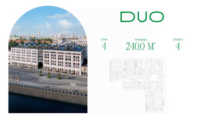 Квартира площадью 240 кв. м. с окнами на две стороны света. Окна кухни-гостиной смотрят на уютную внутреннюю территорию, из мастер-спальни и кабинета открывается вид на Водоотводный канал с фонтанами и историческую часть Москвы. Продуманная планировка позволяет разместить четыре спальные комнаты с отдельными санузлами и гардеробными, кабинет, постирочную и кухню-гостиную. Клубный дом DUO расположен в самом центре города, на Софийской набережной острова Балчуг в нескольких минутах от Кремля. DUO воплощает в себе дуальность наследия прошлого и архитектуры будущего. Историческое наследие дополняется современными архитектурными решениями и технологиями, создавая пространство вне времени. В проекте (для покупки доступны) 51 эксклюзивная коллекционная квартира с видом на Москву-реку, а также роскошный 2-уровневый пентхаус 1150 м2 с собственным бассейном площадью 54 м2 и видом на Кремль. Владельцам квартир DUO будет доступна камерная инфраструктура, включающая в себя: изысканные лобби, комнаты для отдыха и переговоров, винотеку, кинозал, 2-уровневый подземный паркинг внутри клубного дома, зона для хранения колясок и велосипедов. Рядом расположены знаковые места города: Московский Кремль, Александровский сад, Репинский сквер, Храм Христа Спасителя, ГЭС-2, парк искусств "Музеон" и Третьяковская галерея. Такая исключительная локация позволит резидентам наслаждаться преимуществами приватной атмосферы, оставаясь в эпицентре городской жизни.