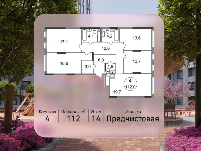 Продается четырехкомнатная квартира в городе-парке "Переделкино Ближнее". Общая площадь квартиры - 109,4 кв. м, этаж 13 из 17. Срок сдачи - 1 квартал 2028 года. Тип дома - монолитный. ТОЛЬКО ДО 31 МАРТА выгодные условия на приобретение квартиры в ипотеку или рассрочку. Звоните - и мы подберем оптимальное предложение под ваш запрос! Корпус расположен в 13 фазе строительства и состоит из 8 секций с переменной этажностью 12-17 этажей. Все секции без отделки. Около 13 фазы запланировано строительство многоуровневого паркинга на 300 м/мест. 13 фаза имеет уникальное расположение и находится непосредственно на берегу Федосьинского пруда, который является сердцем города-парка "Переделкино Ближнее". Город-парк "Переделкино Ближнее" расположен в 8 км от МКАД по Боровскому шоссе. ТРАНСПОРТНАЯ ДОСТУПНОСТЬ: - 15 минут пешком до станции МЦД-4 "Мичуринец" - 25 минут пешком до станции метро "Рассказовка" Солнцевской линии - 30 минут до центра Москвы - 2026 г. - открытие трассы Солнцево-Бутово-Варшавское шоссе РАЗВИТАЯ СОЦИАЛЬНАЯ ИНФРАСТРУКТУРА: - 7 детских садов, 3 школы - банки, продуктовые магазины, аптеки, фитнес центры, салоны красоты и пр БЛАГОУСТРОЙСТВО: - дворы без машин - игровые зоны и развивающие детские площадки - зоны для созерцательного и медитативного отдыха - зоны для занятий спортом ОСОБЕННОСТИ АРХИТЕКТУРЫ: - высокие потолки от 3,03 м - безбарьерные входные группы - колясочные в каждой входной группе - кладовые помещения расположены на -1 этаже каждой секции - в каждой секции 2 лифта: 1 пассажирский, 1 грузовой - на фасаде предусмотрены корзины для установки кондиционеров АВТОРСКИЙ ДИЗАЙН: Входные группы выполнены по авторскому дизайну, благодаря панорамному остеклению наполнены естественным светом. В каждой входной группе будет располагаться комфортабельная зона ожидания с возможностью зарядить электронные устройства, почтовые ящики, колясочная, акцентные пуфы и столик.