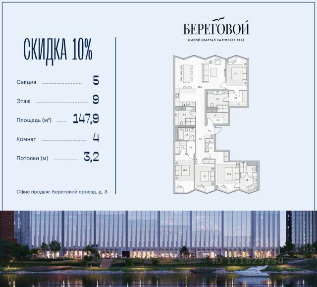 Река. Парк. Сити. Готовый дом в идеальном месте. Продается 4-комнатная квартира на 13 этаже с панорамным остеклением и видом на Береговой пр-д. Береговой — квартал-курорт в центре столицы. Готовый дом на первой линии Москвы-реки. Пешеходная набережная начинается прямо от дома — никаких дорог между вами и рекой. Уникальное сочетание природы парка Фили и ритма Сити. Ключи от нового образа жизни в Береговом: • 12 террас на крышах — ваши виды на Москву с высоты птичьего полета • Пешеходная набережная прямо у дома — ни одной машины между вами и рекой • Лобби с камином, переговорной и консьерж-сервисом • Флагманский Encore Fitness — самый большой в сети (4700 м²) с бассейном, термами и спа-комплексом • Детство на берегу Москвы-реки — в рамках проекта будут построены две школы и детский сад рядом с домом • Гастрономическая набережная: рестораны и премиум-сервисы откроются на первых этажах • Причал "Береговой" рядом с домом — путешествуйте по городу, пока другие стоят в пробках • Безопасность и уединение: контроль доступа на территорию, видеонаблюдение и круглосуточная диспетчерская • Двухуровневый подземный паркинг и кладовые Безупречная квартира для жизни: • Пространство света и воздуха: панорамные окна и высокие потолки 3.2 м • Технологии: центральное кондиционирование и роботизированная система очистки фасадов — вид из окна всегда будет идеальным • Совершенство планировки: просторная кухня-гостиная, минимум коридоров, максимум полезной площади • Квартира без отделки — возможность раскрыть преимущества планировки в вашем уникальном интерьере. Или выбирайте свою версию идеального дома в коллекции планировок: • С изолированными спальнями • Мастер-спальнями с гардеробными и ванными • Видовые ванные комнаты • Функциональные постирочные Эксклюзивные лоты: • Пентахусы с приватными террасами • Двухуровневые пентхаусы Локация, о которой мечтают 15 минут до Сити на машине — и вы в эпицентре деловой жизни. Две станции метро в пешей доступности — когда каждая минута на счету. Утром — пробежка по парку Фили, вечером — прогулка на велосипеде вдоль реки, выходные — водный спорт в Крылатском. Речные трамвайчики вместо такси, зеленые парки и благоприятная экология — привилегии престижного ЗАО Москвы. Условия покупки: выгодные программы покупки от застройщика, специальные условия при полной оплате. Оставляйте заявку на персональную презентацию в шоу-руме. 4-комнатная квартира рядом с метро Мневники.