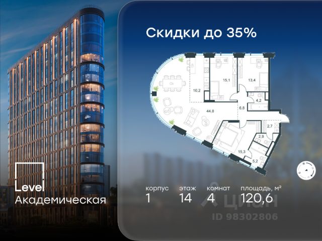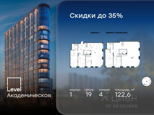 Цена указана с учётом скидки при 100%-й оплате, несубсидированной ипотеке, рассрочке (кроме программы "Рассрочка 0%"). В Академическом районе продаётся 4-комнатная квартира площадью 120.60 кв.м без отделки. Квартира расположена на 14-м этаже 19-этажного жилого комплекса бизнес-класса Level Академическая (компания Level Group). Отличная транспортная доступность: - 1 мин. пешком до станции метро "Академическая"; - 4 мин. на автомобиле до ТТК; - 8 мин. на автомобиле до Садового кольца; - 13 мин. на автомобиле до Кремля. Продуманный архитектурный проект: - современная архитектура от бюро UNK project; - высокие потолки в квартирах до 6,62 м; - окна в пол высотой 2,5-2,68 м с панорамным видом на МГУ, Москва-Сити и другие доминанты Москвы; - квартиры с моллированным остеклением - радиусные окна открывают увеличенный угол обзора; - более 20 вариантов планировочных решений; - уникальные квартиры с собственным патио и возможностью обустройства дровяного камина; - квартиры сдаются без отделки, что открывает свободу для создания интерьера по своему вкусу. Расположение: Камерный проект из 1 корпуса расположен тихом зеленом районе Москвы, в непосредственной близости к центру города. В округе построено 80 детских садов, 50 школ и 30 вузов, 7 из которых входят в топ100 вузов России: МГУ, МГИМО, РАНХиГС, МИСИС, РУДН, РЭУ им. Плеханова и РГУ нефти и газа им. Губкина. Этот район буквально утопает в зелени парков, начиная с уютного Академического в 6 минутах пешком и заканчивая одним из крупнейших в городе парком 50-летия Октября (12 минут на автомобиле). Общая площадь природных объектов в радиусе 2-6 км от дома - 476,5 га. Внутренняя инфраструктура: На территории Level Академическая откроется собственный торговый центр, а для отдыха жителей будут созданы общественные пространства: комфортное лобби с дизайнерской отделкой, окнами в пол и потолками высотой 4,5 м, а также две благоустроенные зоны - территория по периметру здания и пространство на стилобате. Во дворе на стилобате предусмотрены детская и спортивная площадки, коворкинг и лаунж-зона на открытом воздухе. Стилобат украсят скульптуры животных - жирафа, зайца и волка, которые станут ярким акцентом внутреннего двора Level Академическая, подчеркивая близость к музею Дарвина. Процент озеленения территории - 58%. Технологии и безопасность: Жителей Level Академическая не коснется ежегодное отключение горячей воды благодаря собственным центральным водонагревателям. Безопасность гарантирует круглосуточная охрана, безлимитный Wi-Fi, круглосуточное видеонаблюдение. Удобное перемещение внутри комплекса будут обеспечивать 5 лифтов с доступом в паркинг с жилых этажей. 4-комнатная квартира рядом с метро Профсоюзная.