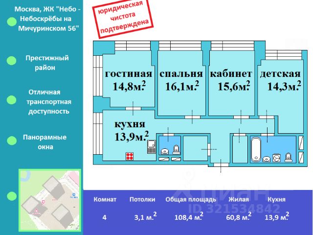 ID 64929: Эксклюзивно в компании INTERMARK. ЖК Счастье на Ломоносовском. Потрясающая 4-х комнатная квартира в новом элитном ЖК "Счастье на Ломоносовском". Окна на 3 стороны света, самый лучший тип планировки не только в рамках данного проекта, но и в принципе! Великолепные виды из окон - на МГУ, парковый ансамбль и Москва-Сити. Солнце движется вокруг квартиры: рассвет в кухне-гостиной, утреннее солнце в спальнях, закат в кабинете! Продуманная до мелочей и самая полная техническая начинка с лучшими инженерными решениями. Профессиональный дизайн проект и тех.надзор. В квартире заканчивается ремонт до стадии отделки - вайт бокс. Уже выполнены следующие работы: возведение стен из блоков и штукатурка, шумоизоляция пола и стяжка, проф.шумоизоляция потолка (каркасная система PhoneStar БСС 1.1), шумоизоляция стен (бескаркасная система PhoneStar КСПМвП 1.1), разводка водоснабжения, канализации, отопления, системы защиты от протечек, разводка электрики/освещения/систем умного дома, даже подразетники установлены в специальном шумозащитном корпусе. Сейчас заканчиваются работы по монтажу профессиональной системы кондиционирования и собственной приточной вентиляции. Очень высокие потолки - 3,52 метра было изначально, с ремонтом высота - 3,30 метра! Спланированы просторная кухня-гостиная с 4 окнами на 2 стороны света, хозяйская спальня со своей гардеробной комнатой, детская спальня с гардеробной, кабинет/гостевая спальня, 2 больших ванные комнаты, постирочно-гладильная, также есть лоджия с панорамным остеклением. Высота дверей - 2,50 метра. За дополнительную цену к квартире можно купить большое и удобное м/место в подземном паркинге, ширина места 2,85 метра. Дом клубного формата премиум класса - всего на 56 квартир, выполнен в стиле сталинского ампира, роскошный вестибюль с зоной отдыха на 1 этаже, консьерж-сервис, колясочная комната, охрана 24 часа, огороженная территория с ландшафтным дизайном, детская площадка с горкой и вращающимися на подиуме креслами, подсветка фасада, гостевой паркинг, профессиональная управляющая компания, лифты KONE опускаются в гараж без пересадок. Потрясающая локация, в 3 минутах пешком метро Ломоносовский проспект, 10 мин пешком главное здание МГУ им. Ломоносова, в 200-х метрах Сквер у Китайского посольства с озером и изящными прогулочными дорожками, напротив него - Ботанический сад МГУ, Ленинские Горы и Большой газон МГУ, Воробьевы Горы, самая лучшая инфраструктура района. Высочайший уровень безопасности, рядом расположены 28 Посольств иностранных государств. ПРЯМОЙ ПРЕДСТАВИТЕЛЬ СОБСТВЕННИКА. БОНУС АГЕНТУ. ОПЕРАТИВНЫЙ ПОКАЗ. БЕЗ КОМИССИИ ДЛЯ ПОКУПАТЕЛЯ. Intermark Real Estate - участник ассоциации AREA. Брокер объекта Говорин Владимир. Мы работаем в выходные и праздничные дни, будем рады вашим звонкам в любое время. Купить 4-комнатную квартиру рядом с метро Раменки.