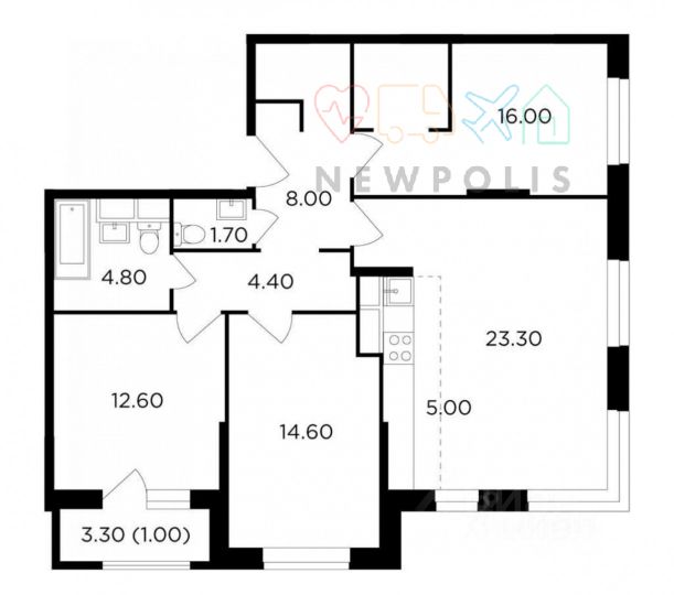 Два сан.узла (4,5 кв.м/ 5 кв.м) вместительная душевая 1*1м, ванная Villeroy&Boch