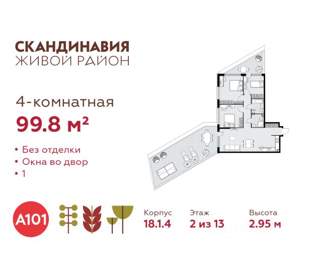 Продается четырехкомнатная квартира 712 в новостройке Жилой район "Скандинавия" по адресу Москва, ТиНАО, Новомосковский АО, Сосенское С/П, Коммунарка пос., жилой комплекс Скандинавия, к23.6, район Коммунарка, Новомосковский административный округ, Москва. Общая площадь квартиры - 118.70 кв. м., этаж 11 из 15, секция 8. Тип проекта, по которому построен дом - монолит, компания-застройщик - ООО "А101". Стоимость квартиры - 37216011 Р. ПРЕДЛОЖЕНИЯ ОТ ЗАСТРОЙЩИКА В ФЕВРАЛЕ 2026: Скидки до 10% на все квартиры. Только в офисах продаж до 28 февраля. Ипотека от 13,9 % для всех! На весь срок. "Семейная ипотека" вернулась. Ставка от 3,5 % на весь срок! Без удорожания! Выгодное ипотечное комбо: Ипотека от 2200 р./мес. и от 6 % после рождения ребёнка! Ипотека для всех "Держи пять!" - ставка 5 % на 2 года! *более подробную информацию по скидкам и акциям уточняйте в отделе продаж ЖК "Скандинавия" на границе Бутовского лесопарка (1610 га) - это баланс качественного жилья и сервисов, зелёных пространств для активного и созерцательного отдыха. Выразительная архитектура и цветовая гамма монолитных корпусов комфорт- и бизнес-класса (8-17 этажей) созвучны скандинавским мотивам, органично интегрированы в великолепный природный контекст. Огороженные дворы свободны от машин, в них продуманы места для отдыха и работы на свежем воздухе, озеленение, детские и спортивные площадки. Для прогулок, встреч и районных праздников - площадь Туве Янссон с "сухим" фонтаном, вековыми дубами и единственным в мире памятником писательнице; пешеходный променад 2 км; 3 крупных природных ручья; более 15 км велосипедных и прогулочных дорожек с арт-объектами. Инфраструктура района включает современные школы и детские сады, центр впечатлений, фитнес-клубы, развивающие и творческие центры, магазины, кафе, салоны красоты. На подземных этажах - паркинги и кладовые. Преимущества "Скандинавии": - ст. метро "Потапово" - 100 м от ближайших домов (открыта!) - удобные выезды на трассу Солнцево - Бутово - Варшавское шоссе и ул. Бачуринская - свои школы и детские сады - инфраструктура на первых этажах и рядом с домом - лесопарк, природные водоёмы, прогулочные маршруты