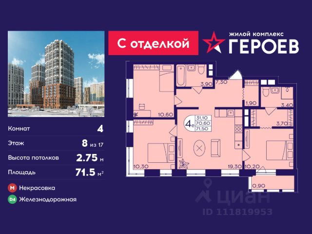 Продаётся 4-комнатная квартира 66.2 кв. м. в жилом комплексе "Героев" в Балашихе, Железнодорожный. Квартира расположена на 25 этаже 611 корпуса. Все квартиры представлены с чистовой отделкой. Вам не нужно тратить время и дополнительные финансы на ремонт или жить в шуме строительных работ - достаточно перевести свои вещи, расставить мебель и всё готово! Жилой квартал "Героев" - это уютный проект для семей с детьми. Всего 40 минут до центра Москвы. В квартале созданы все условия для досуга всех возрастов: игровые и спортивные площадки, места для отдыха и прогулок, магазины, кафе и пункты выдачи. За 15 минут можно дойти от дома до Ольгинского лесопарка - популярного места для прогулок и отдыха на свежем воздухе. Здесь приятно гулять всей семьёй, заниматься спортом или устроить пикник в выходной день. Преимущества: Квартира с готовой отделкой. Пространство полностью подготовлено для жизни: не нужно тратить время и деньги на ремонт или ждать его окончания. После получения ключей достаточно расставить мебель - и можно сразу заезжать и жить. Продуманные и светлые планировки. Просторные кухни-гостиные создают комфортное пространство для отдыха и встреч с близкими. В квартирах предусмотрены удобные гардеробные, благодаря чему легко поддерживать порядок и не перегружать комнаты шкафами. Увеличенное остекление. Большие окна наполняют квартиру естественным светом в течение всего дня, создавая ощущение простора и уюта, а также визуально расширяя пространство и делая интерьер более воздушным. Пешая доступность до станции Железнодорожная (МЦД-4) - дорога займёт не более 30 минут до центра Москвы: станции метро "Курская", "Площадь Ильича" или ТПУ Нижегородская.