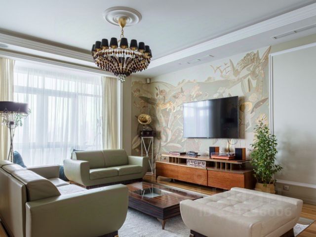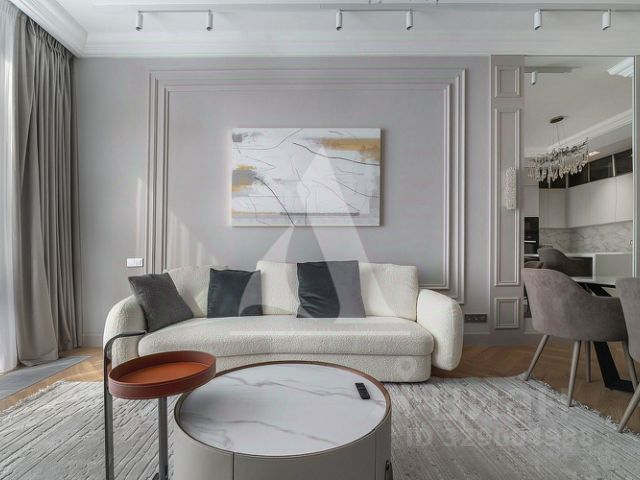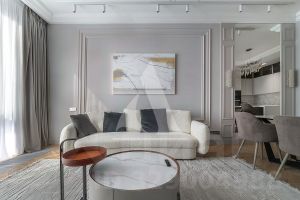 Стены отделаны художественной штукатуркой, многоуровневое селективное освещение, ночные светильники с датчиками движения, подогрев полов в ванной. На полу ламинат с дополнительной шумоизоляцией.