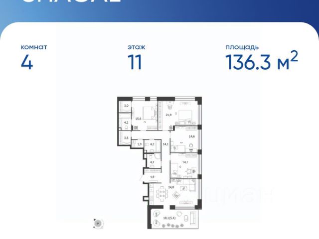 Продается квартира 171, по адресу г. Москва, ЮАО, Даниловский, ул. Автозаводская, вл. 23/75, корпус Жилой квартал Shagal, 3 очередь, 4 этап, корпус 3 в Shagal на 11 этаже, с площадью 136.3 м2.