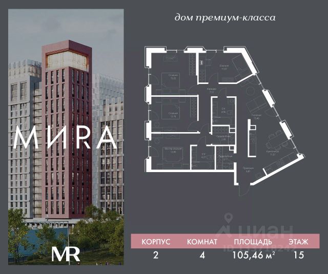 Прямая продажа от застройщика. Продаётся 4-к квартира общей площадью 106.35 м² без отделки в доме премиум-класса МИRА на 3-м этаже 23 этажного дома. Квартира расположена в корпусе 2. Дом премиум-класса МИRA это: • Спокойный район с богатой историей и сложившейся инфраструктурой • Авторская архитектура на стыке классики и современности • Вход в парк прямо из жилого комплекса • Панорамные виды на Яузу, парки, ВДНХ и скульптуру "Рабочий и колхозница" • Удобные сервисы и безопасность для каждого резидента Расположение: Жилой квартал расположен в Алексеевском районе на северо-востоке Москвы, на второй линии домов, таким образом вы сможете дистанцироваться от шума и суеты проспекта Мира, но при этом будете жить недалеко от этой важной городской магистрали. Прямо у дома: • Парк Акведук • Река Яуза • Памятник "Рабочий и колхозница" Пешком: • 16 мин м. ВДНХ На автомобиле: • 12 мин ТТК • 15 мин Садовое кольцо • 12 мин Национальный парк "Лосиный остров" Благоустройство: Концепция благоустройства от бюро "ДРУЖБА" разработана в стиле "Лесная тропа". В уютном дворе расположились словно затерянные в лесу, площадки для отдыха. Они разделяются островками с травами, кустарниками, крупными камнями и деревьями, между которыми проходят узкие песчаные тропинки с деликатной подсветкой по вечерам. Центральной точкой притяжения для жителей станет главная площадь с фонтаном, которая открывается сразу из двух входных групп. Внутренний двор МИRA: • Детская площадка с зонами для игр малышей до трех лет и детей более старшего возраста • Спортивная площадка с профессиональным оборудованием для тренировок • Декоративные перголы • Воздушный арт-объект с подсветкой, похожий на облако • Чайный домик, где в отдельном отапливаемом павильоне можно в любое время года попить кофе с соседями или устроить камерное семейное чаепитие • Зоны для работы и отдыха с гамаком под навесом, скамейками и креслами Инфраструктура и окружение: В Алексеевском районе есть огромные благоустроенные парки, магазины, гимназии с высоким рейтингом и филиалы ВУЗов, частные и государственные детские сады, модные кофейни и фитнес-центры. В квартале МИRА предусмотрены: • 2 ресторана с видом на парк Акведук • 3 кафе • фитнес-студия • подземный паркинг на 330 машино-мест Компания MR Group предлагает своим клиентам специальные условия приобретения квартир в рамках программ ипотечного кредитования от банков-партнеров. Купить 4-комнатную квартиру станция Ботанический сад (МЦК).