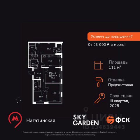 УСПЕЕТЕ КУПИТЬ ДО ПОВЫШЕНИЯ? От 53 000 рублей в месяц! Прямая продажа от застройщика! Жилой Комплекс бизнес-класса. Продаётся 4-к квартира номер 1215 общей площадью 111 кв.м. на 4-м этаже 30 этажного здания. Отделка Whitebox. Цена с учётом скидки. Особенности квартиры: - Мастер-зона с санузлом и гардеробной. Всё для вашего комфорта и удобства, включая личный санузел и гардероб. - Распашная планировка - отличное сочетание удобства и свободы. - Увеличенная ширина окна/окон - больше света и визуального простора. - Угловое остекление - свет и воздушность в каждой комнате. - Гостевой санузел - комфорт и удобство для ваших гостей. - Постирочная - организуйте пространство для стирки и сушки вещей. - Гибкая планировка - создайте пространство по своему вкусу. - Место для игры/занятия спортом - идеальное пространство для активных детей. - Можно оборудовать 2 или более рабочих места - пространство для нескольких человек. - Можно оборудовать рабочее место - комфорт для работы и учёбы. - Можно сделать распашные двери - удобный доступ и стильный акцент. - Просторная кухня - место для семейных ужинов и кулинарных экспериментов. - Просторная мягкая зона - комфорт и уют для отдыха всей семьи. - Линейная кухня - функциональность и практичность в одном решении. - Гардеробная - удобство для хранения и организации вещей. - Ниша под шкаф - компактное и удобное место для вещей. - Лоджия - уютное место для отдыха и тишины. Квартира с предчистовой отделкой (White box). Вам не придется заниматься черновыми и трудоёмкими работы, а чистовую отделку и дизайн - сделайте на свой вкус. Информация о комплексе: Sky Garden расположен в районе Покровское-Стрешнево. На территории этого района шумит листвой одноименный парк. Зеленый живописный район, реки и каналы поблизости, чистый свежий воздух из подмосковных листов - идеальное место, чтобы ощутить себя частью природы. При этом развитая образовательная, социальная и транспортная инфраструктура оставят вам все преимущества жизни в мегаполисе. Sky Garden - идеальный баланс между природной и городской средой. Транспортная доступность: Всего в 12 минутах пешком до м. Тушинская и 15 минутах до станции Тушинская МЦД. На автомобиле: 2 км до Волоколамского шоссе, 2,5 км до МКАД и 15 км до Садового кольца Внутренняя инфраструктура: К вашим услугам современные игровые площадки: тут ваши дети с удовольствием смогут лазить по бревнам, штурмовать горки и стараться не промокнуть, бегая под струями фонтана. В Sky Garden полно возможностей как для совсем маленьких, так и для взрослых. Предусмотрены активности: мастер классы по йоге на английском газоне, воркаут- площадка, велопарковки. Также в вашем распоряжении на территории комплекса будут: поликлиника, аптека, супермаркет, зона для отдыха, сухой фонтан и площадка для подростков. Пространство для работы, оборудованное кофепоинтом и удобными переговорными. Также к вашим услугам кафе и рестораны в коммерческом кластере. Игровая комната, расположенн