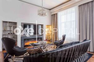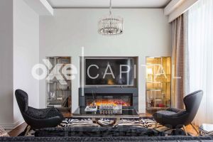 Квартира после ремонта, в отделке и мебели использованы только натуральные материалы: мрамор, травертин, ценные породы дерева. В гостиной установлен дровяной камин. Ванная комната в мастер-спальне - каррарский мрамор, вторая ванная комната - натуральный травертин, потолки в ванных комнатах - массив тика. Межкомнатные двери, полы и мебель - из благородных сортов натурального дерева.