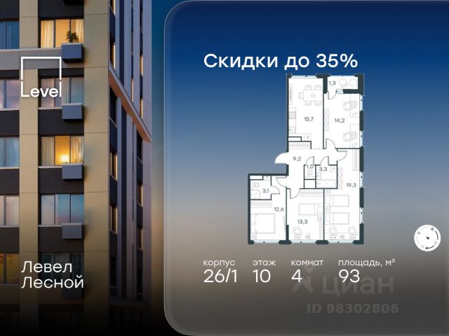 Цена указана с учётом скидки при 100%-й оплате, несубсидированной ипотеке, рассрочке (кроме программы "Рассрочка 0%"). В районе, утопающем в густой зелени лесов, многочисленных парков и скверов, продаётся 4-комнатная квартира площадью 93.00 кв.м с отделкой white box. Квартира расположена на 10 этаже в жилом комплексе комфорт-класса Левел Лесной (компания Level Group/Левел групп). Отличная транспортная доступность: - 25 мин. пешком до станции метро "Пятницкое шоссе"; - 28 мин. на автобусе до станции метро и МЦД-2 "Волоколамская"; - 11 мин. на авто до МКАД; - 25 мин. на авто до ТТК. Продуманный архитектурный проект: - Концепция проекта Левел Лесной от бюро СПИЧ; - Высотность комплекса до 15 этажей с уникальными видами на лесные массивы и город; - Высота потолков до 3 м; - Современные окна высотой до 1,6 м, в части квартир предусмотрены окна в пол. Высота подоконников 0,6 м; Расположение: Жилой комплекс Левел Лесной строится в зелёной зоне ближайшего Подмосковья, г.о. Красногорск в посёлке Отрадное. Шаговая и автомобильная доступность до метро и больших транспортных артерий города. За 25 минут вы дойдёте до станции метро "Пятницкое шоссе", а за 20 минут на машине сможете доехать до станции метро "Тушинская". Район окружен роскошной зеленью лесов и парковых зон, занимающих территорию свыше 1 000 гектаров. Помимо благоприятной экологии, здесь множество возможностей для активного отдыха и поддержания физической формы. Облагороженная территории с полностью развитой инфраструктурой. На территории проекта находится детский сад и школа "Светлые Горы", которая входит в список лучших частных школ от Forbes Education (по данным на 2023г.). Кроме того, в пешей доступности расположено ещё 8 детских садов, а также запланировано открытие современной муниципальной школы. В непосредственной близости находятся сетевые супермаркеты и локальные магазины, аптеки, клиники, почта, библиотека, салоны красоты, рестораны, спортивные и творческие секции, развивающие детские центры. В 12 минутах пешком расположен торговый парк "Отрада" с продуктовым и строительным гипермаркетами, магазинами, кинотеатром и развлечениями для детей. Внутренняя инфраструктура: Мы знаем, как важно, чтобы магазины и сервисы были всегда рядом. В сданных корпусах жилого комплекса Левел Лесной уже расположена полностью готовая развитая инфраструктура. На первых этажах корпуса 27 предусмотрено ещё 14 коммерческих помещений. Благоустройство: Продуманное пространство и аура приватного европейского городка рождают чувство лёгкости и расслабления у каждого, кто попадает на территорию проекта. Концепцию общественных площадок разработали в партнёрстве два архитектурных бюро: "Хайлайт Архитектура" (Highlight Architecture) и "Скейп" (Scape). В безопасных дворах без машин каждый обязательно найдёт себе место для вдохновения, отдыха и спорта.