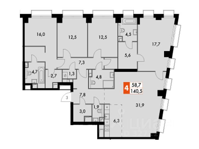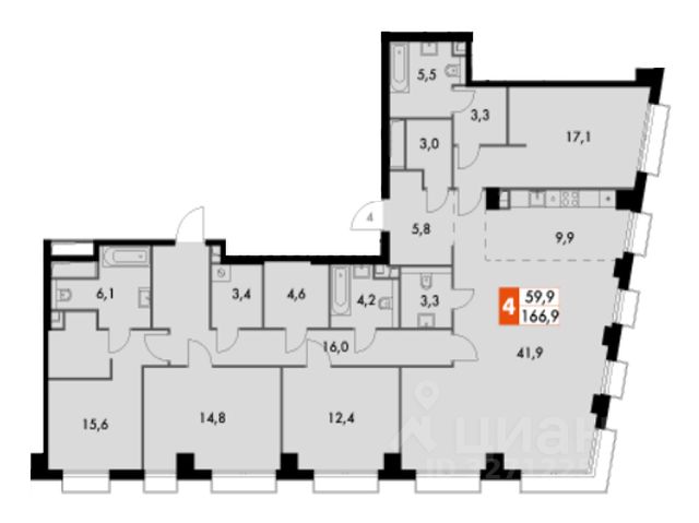 Цена указана с учётом скидки при 100%-й оплате, несубсидированной ипотеке, рассрочке (кроме программы "Рассрочка 0%"). В жилом квартале продаётся 4-комнатная квартира площадью 96.80 кв.м white box. Квартира расположена на 48 этаже 48 этажного корпуса 1 в жилом комплексе комфорт класса Левел Звенигородская (компания Level Group/Левел групп). Отличная транспортная доступность - 5 мин. пешком до метро "Звенигородская" (откроется к окончанию строительства); - 18 мин. пешком до станции МЦК "Хорошёво" и станции БКЛ "Народное ополчение"; - 4 мин. на авто до ТТК; - 8 мин. на авто до Садового кольца; - 15 мин. на авто до Кремля. Продуманный архитектурный проект - Концепция от студии Станислава Михаловского, в основу которой легло единение природы и города; - Двухкамерные стеклопакеты в окнах, алюминиевый и ПВХ профиль - в квартирах тепло зимой и прохладно летом; - С верхних этажей откроются панорамные виды на город, Москву-реку, "Москва-Сити" и Москворецкий парк; - Лобби со всеми удобствами: окна в пол, высокие потолки до 4,7 м, лаунж-зоны, колясочные, гостевые санузлы и мойки для лап животных; - Централизованные водонагреватели гарантируют круглогодичную подачу горячей воды в каждую квартиру. Благоустройство Концепция благоустройства разработана совместно с бюро UNK landscape. Высота башен приближается к 200 метрам - они словно касаются неба. Небесный простор проецируется на территорию двора с помощью подсветки, визуально увеличивая пространство и отражаясь в авторских элементах архитектуры. На территории площадью 0,45 га расположатся: - "Облако событий" - место встреч и общения; - "Облако спорта" - всё для поддержания себя в форме; - "Облако принятия решений" - пространство для работы на свежем воздухе; - "Облако спокойствия" - для отдыха в тишине природы; - "Облако игр" - площадки для подростков и самых маленьких. Инфраструктура В жилом комплексе откроется 21 коммерческое помещение: продуктовые лавки, кафе, салоны красоты, службы доставки и творческие студии. Этап 1 включает строительство двухуровневого подземного паркинга. Всего здесь расположится 351 машино-место, включая семейные места, и 264 кладовых помещения. В распоряжении жителей развитая инфраструктура района: 15 супермаркетов, 5 спортивных объектов, 9 медучреждений, 7 детских садов, 4 школы, 3 благоустроенных парка - всё в шаговой доступности. Инженерия Комфортное перемещение внутри домов будут обеспечивать надёжные лифты с доступом в паркинг с жилых этажей. В каждом корпусе предусмотрено до шести кабин, включая сервисные лифты. Попасть на территорию комплекса можно только по единому ключу доступа. Видеонаблюдение установлено на входах в подъезды, в лобби, в общих зонах, на въезде в паркинг. Гости смогут связаться с жителями дома через входные видеопанели, а управлять доступом на территорию можно через видеодомофон или приложение на телефоне.