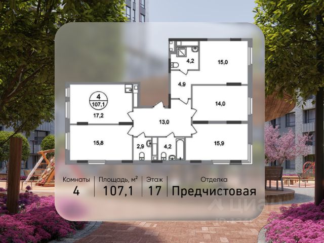 Продается четырехкомнатная квартира с отделкой в 18 фазе города-парка "Переделкино Ближнее". Общая площадь квартиры - 107,1 кв. м, этаж 17 из 17. Срок сдачи - 2 квартал 2027 года. Тип дома - монолитный. ТОЛЬКО ДО 30 АПРЕЛЯ выгодные условия на приобретение квартиры в ипотеку или рассрочку. Звоните - и мы подберем оптимальное предложение под ваш запрос! Корпус состоит из 12 секций c переменной этажностью 8-17 этажей. Город-парк "Переделкино Ближнее" расположен в 8 км от МКАД по Боровскому шоссе. ТРАНСПОРТНАЯ ДОСТУПНОСТЬ: - 10 минут пешком до МЦД-4 "Мичуринец" - 14 минут на машине до станции метро "Филатов Луг" Сокольнической линии - 15 минут пешком до станции метро "Рассказовка" Солнцевской линии - 30 минут до центра Москвы - Прямой выезд на дорогу Солнцево-Бутово-Варшавское шоссе, минуя жилую застройку всего ЖК РАЗВИТАЯ СОЦИАЛЬНАЯ ИНФРАСТРУКТУРА: - 7 детских садов, 3 школы - детская музыкальная школа имени Б.Л. Пастернака - поликлиника для взрослых ГБУЗ ГП 212 ДЗМ филиал 70 - пожарная часть 66. Аварийно-спасательный отряд 6 ГКУ - банки, продуктовые магазины, аптеки, фитнес центры, салоны красоты и пр БЛАГОУСТРОЙСТВО: - дворы без машин - игровые зоны и развивающие детские площадки - детские площадки разделены по возрастным группам - зоны для пассивного отдыха - зоны для занятий спорта ОСОБЕННОСТИ АРХИТЕКТУРЫ: - переменная этажность открывает видовые характеристики на реку Алешинка и на лесопарковую зону - увеличенное остекление в квартирах - высокие потолки от 3,03 м. - безбарьерные входные группы - колясочные в каждой входной группе - кладовые помещения расположены на -1 этаже каждой секции и на 2-17 жилых этажах в секции 11 - коммерческие помещения на 1 этаже в 11 и 12 секциях - в секциях 2-4, 6-7, 11-12 по 2 лифта: 1 пассажирский, 1 грузовой - в секциях 1, 5, 8-10: 1 грузовой лифт - мусоропроводы в домах не предусмотрены, запроектированы специальные зона для сбора мусора - на фасаде предусмотрены корзины для установки кондиционеров. - видеонаблюдение установленное в холлах первых этажей, у подъездов и прилегающей территории АВТОРСКИЙ ДИЗАЙН: Входные группы выполнены по авторскому дизайну, оснащены системой "тёплый пол". В каждой входной группе будет располагаться комфортабельная зона ожидания, почтовые ящики, колясочная, акцентные пуфы и столик.